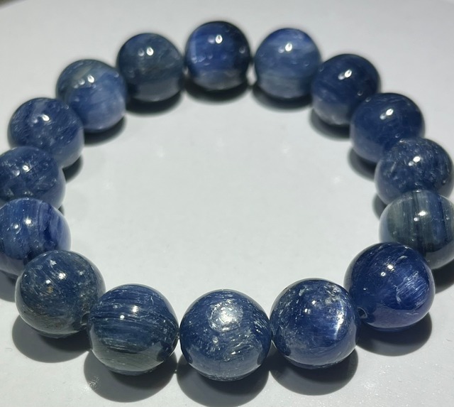 「カイヤナイト ディープブルー ブレスレット」 使用天然石 ・カイヤナイト このカイヤナイト ディープブルー ブレスレットは、深みのある青色と美しい筋模様が特徴の天然石を使用したエレガントなアクセサリーです。 カイヤナイトは精神を落ち着け、集中力を高めるとされるパワーストーンとして知られ、喉のチャクラと関連し、自己表現やコミュニケーション能力を高めるとされています。言いたいことをうまく伝えたい、プレゼンや対話で自信を持ちたい人に適しています。また自己浄化作用があるとされ、ネガティブなエネルギーを取り除きたい人に適しています。 その独特の色合いと光沢は、シンプルながらも洗練されたスタイルを演出し、日常から特別な場面まで幅広くお使いいただけます。 サイズ 内周:約16cm(サイズ調整可能) こんな方におすすめ 1. コミュニケーションを改善したい人