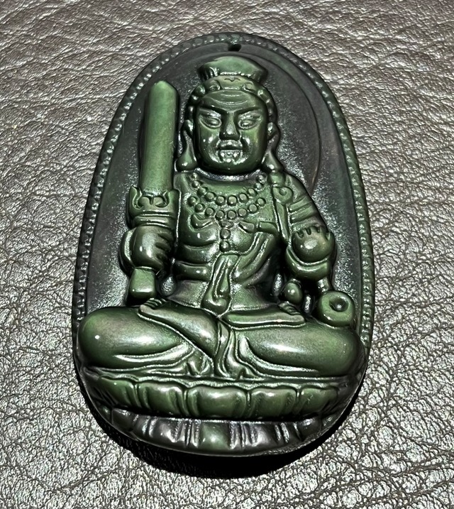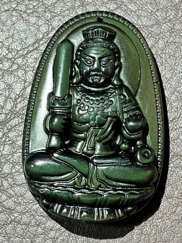 「レインボーオブシディアン不動明王」 商品概要 神秘的な虹色の輝きを湛えたレインボーオブシディアンから精巧に彫り出された、不動明王。 黒く深みのある石体に、光の加減で虹色のシラーが浮かび上がる美しい天然石を使用。伝統的な不動明王の忿怒相を、細やかな工芸で表現した一点もの。 〈不動明王の象徴とご利益〉 不動明王(ふどうみょうおう)は、密教の五大明王の中心に位置する守護尊で、大日如来の化身として知られています。梵名「アチャラナータ(動かざる守護者)」の名の通り、揺るぎない決意で煩悩や災厄を断ち切り、人々を正しい道へ導く慈悲深い仏様。右手の宝剣は悪を斬り、左手は羂索(けんじゃく)で迷いを引き寄せ、背後の炎は邪念を焼き尽くす象徴です。威厳ある表情と上下の牙は、智慧と慈悲の両面を表し、外敵退散、厄除け、開運、精神の安定にご利益があります。 〈レインボーオブシディアンのパワー〉 レインボーオブシディアンは、火山ガラスである黒曜石の一種で、1990年代にメキシコで発見された希少な天然石。表面は漆黒ですが、光の角度で虹色の輝き(赤・緑・紫・青など)が現れ、「道を照らす石言葉」を持っています。ネガティブなエネルギーを吸収・浄化し、直観力や決断力を高め、トラウマや優柔不断を解消。希望の光を呼び込み、精神的な安定と人間関係の調和を促します。不動明王の力強い守護と相まって、日常のストレスから強力に守護するお守りとして最適です。 〈おすすめポイント〉 • デザインの魅力: 不動明王の座像を蓮華台に据え、冠や装飾を細部まで再現。レインボーシラーの神秘的な輝きが、仏像に幻想的な生命力を与えます。 お部屋や玄関にお守りとして飾っていただいたり、バックに入れて持ち歩くなど、この不動明王ペンダントは、災難除けと心の平穏を求める方にぴったり。ご自身や大切な方への贈り物にもどうぞ。 限定入荷につき、お早めにお求めください! 〈サイズ〉 約5×3.5cm 〈商品詳細〉 ・価格 2800円 ・送料:185円(クリックポスト)、     サロンお渡しの方は無料 天使の卵女神塾 ホームページ https://tenshinotamago.net/ アメブロ https://ameblo.jp/angels-2009/