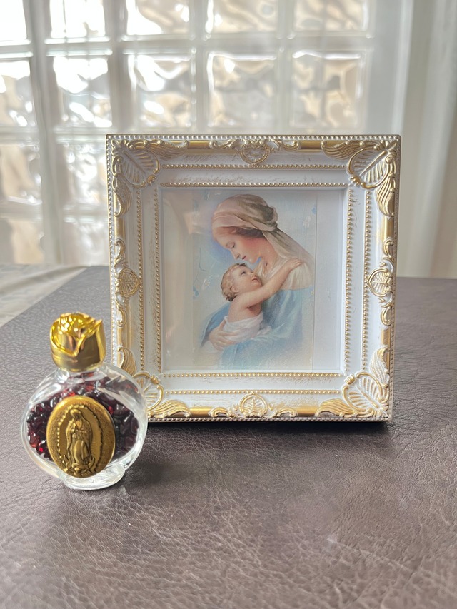 「マリア様のガラスボトル入りさざれ」ゴールドボトル 優しい微笑みで見守ってくださるマリア様のガラスボトルに、天然石のさざれを詰め込みました。 こちらは深い紅が美しいガーネット。 このまま飾って、あるいはお皿などに出してお使いいただくなど、インテリアやお守りとして、心を癒やしてくれる存在です。 さらに、イエス様を抱いたマリア様の美しい姿が描かれたミニカードフレーム もセットになっています。 デスクやお部屋に飾って、日々の祈りや癒しのひとときをお楽しみください。 〈ガーネット(Garnet)〉 「情熱・絆・成功」の石。努力を実らせ、困難を乗り越える力を与えてくれるといわれます。 ・夢や目標に向かって頑張っている方 ・大切な人との絆を深めたい方 ・努力を成果に結びつけたい方におすすめです。 〈セット内容〉 マリア様ガラスボトル(ガーネット) マリア様ミニカードフレーム 価格:送料込み 2,000円 大切な方への贈り物や、ご自身のお守りとしてもぜひどうぞ。 天使の卵女神塾 ホームページ https://tenshinotamago.net/ アメブロ https://ameblo.jp/angels-2009/