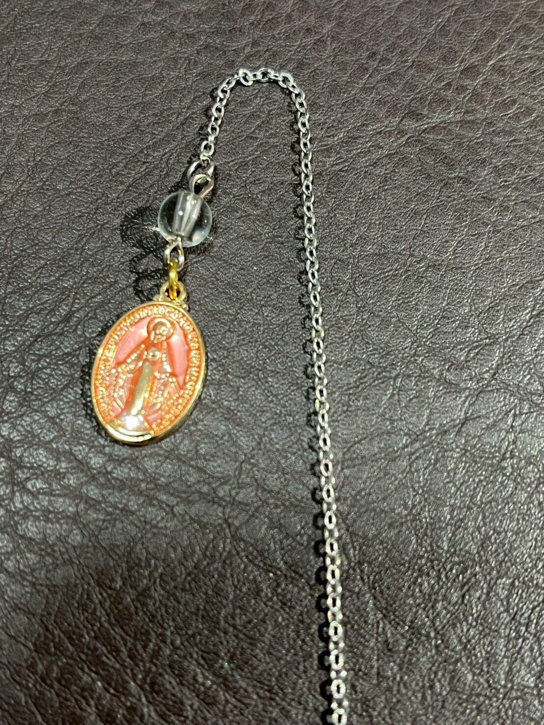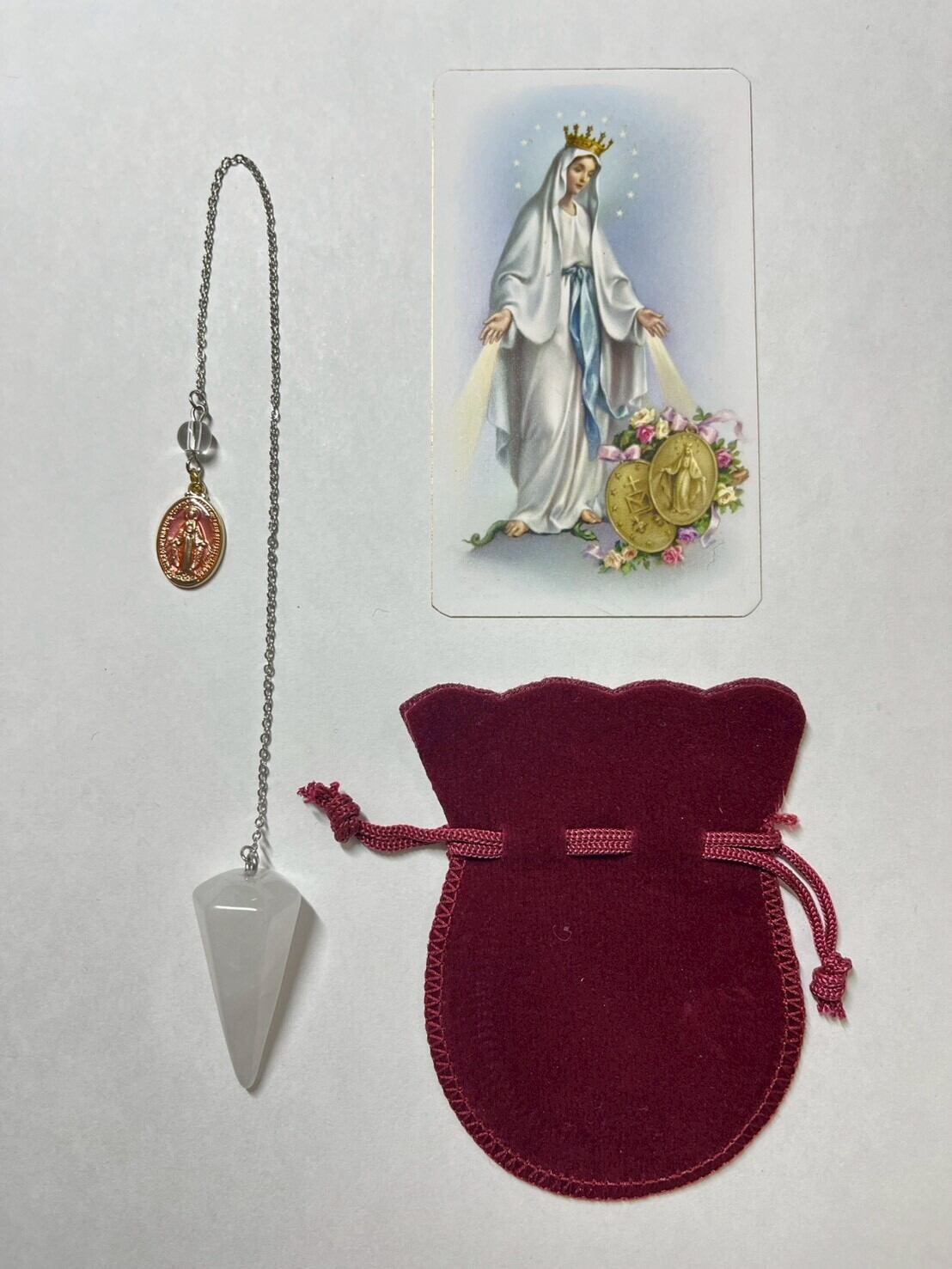 不思議のメダイ(ピンク)付き天然石クリスタルペンデュラム(巾着・天使カード付き)