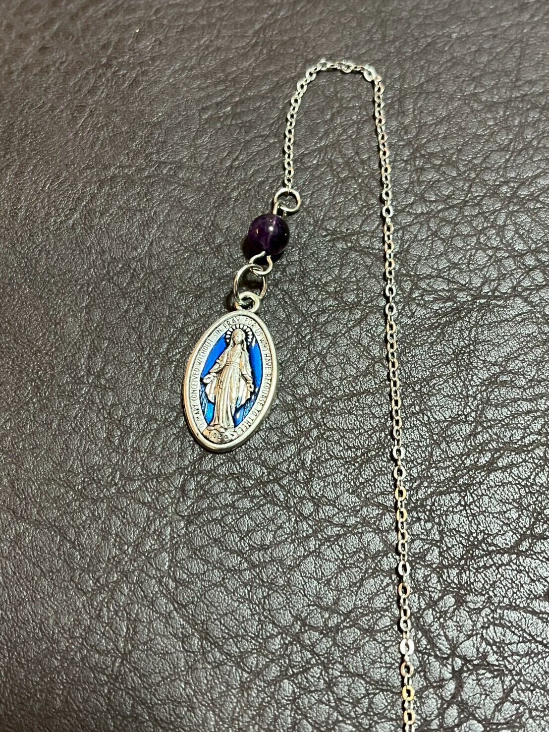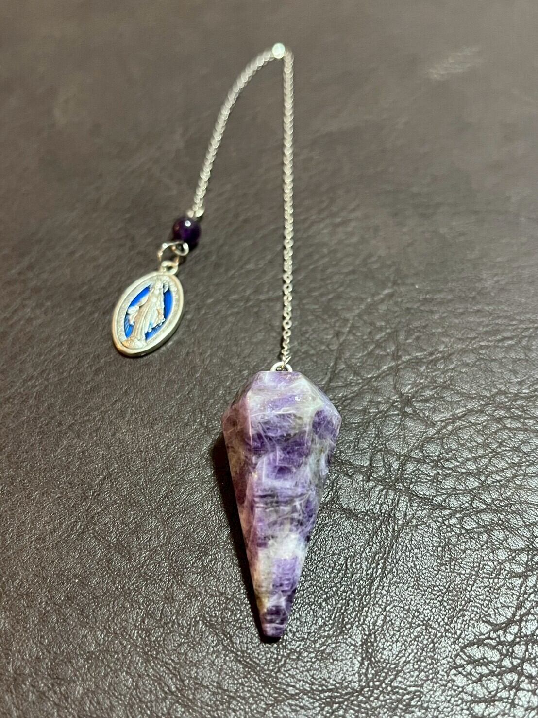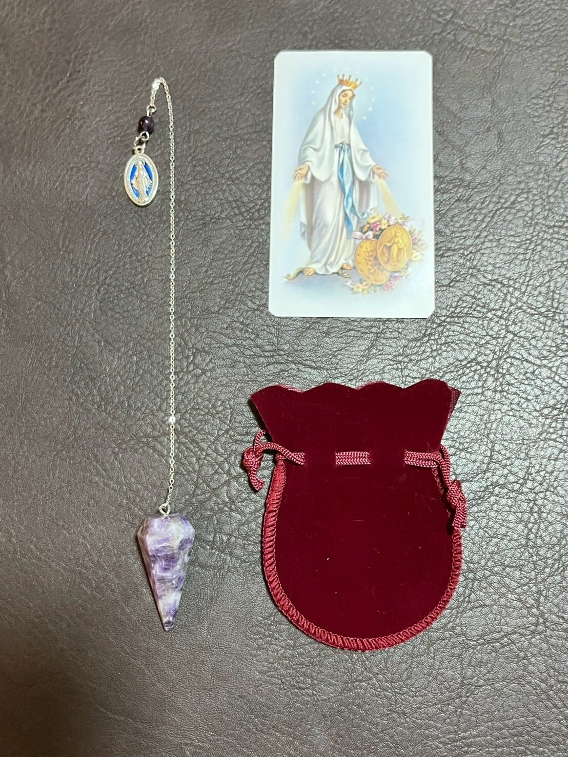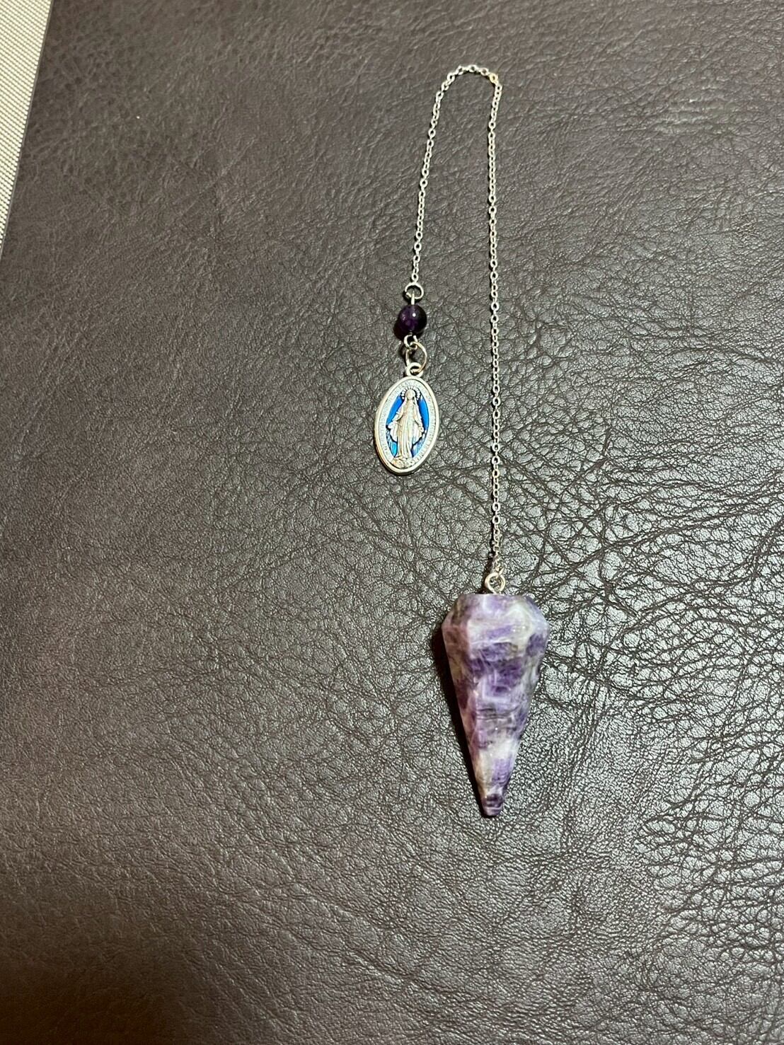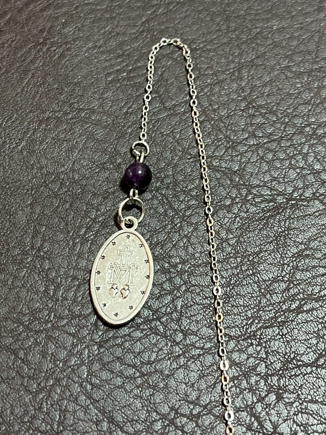 トップ部分には持つ人を守護すると言われる「不思議のメダイ」がついています。チェーンの先には美しい天然石(アメジスト)を使用し、直感や浄化、心の平安をサポート。占いやダウジングはもちろん、日常のお守りとしてもおすすめです。