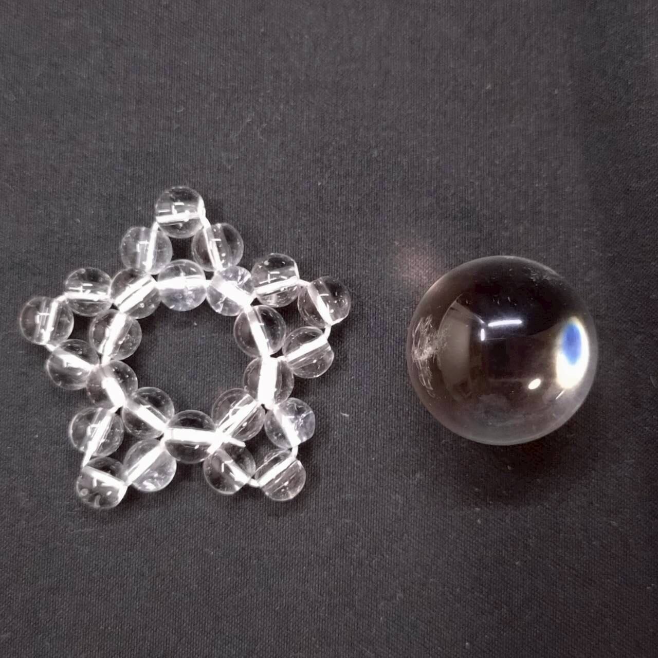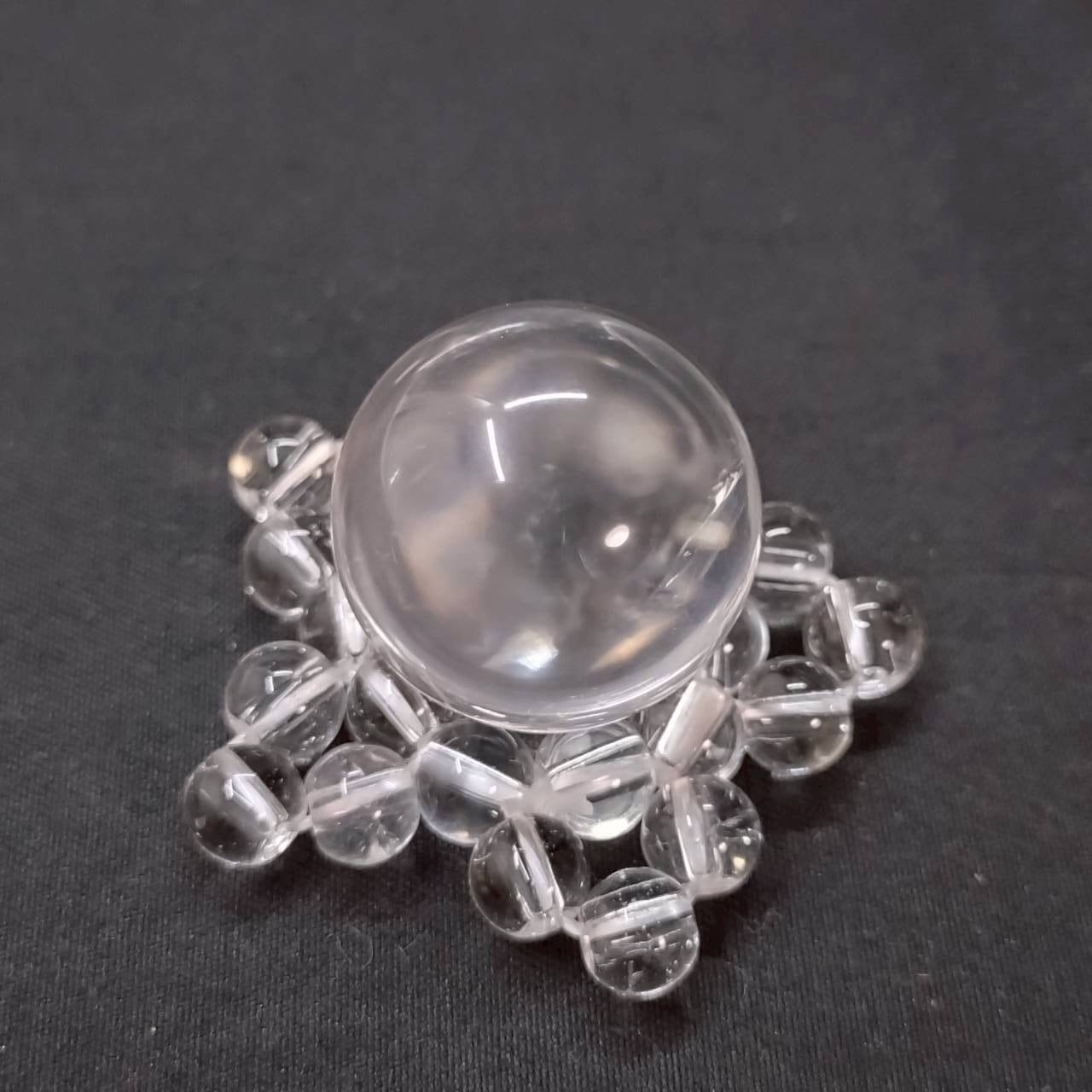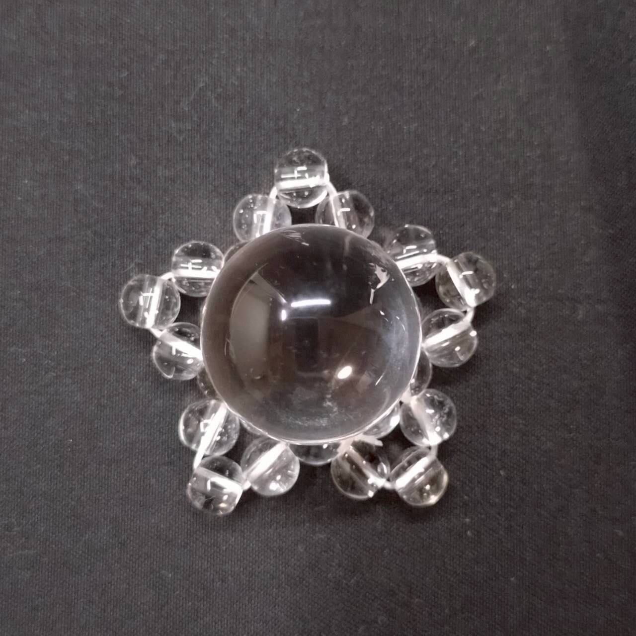 透明感あふれる直径2cmの水晶玉と、五芒星を描くように6mm水晶で編み込んだ台座のセットです。