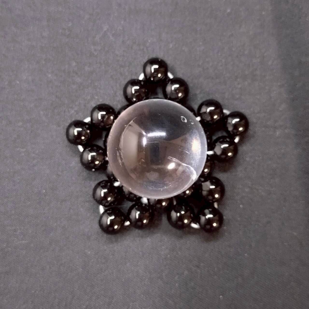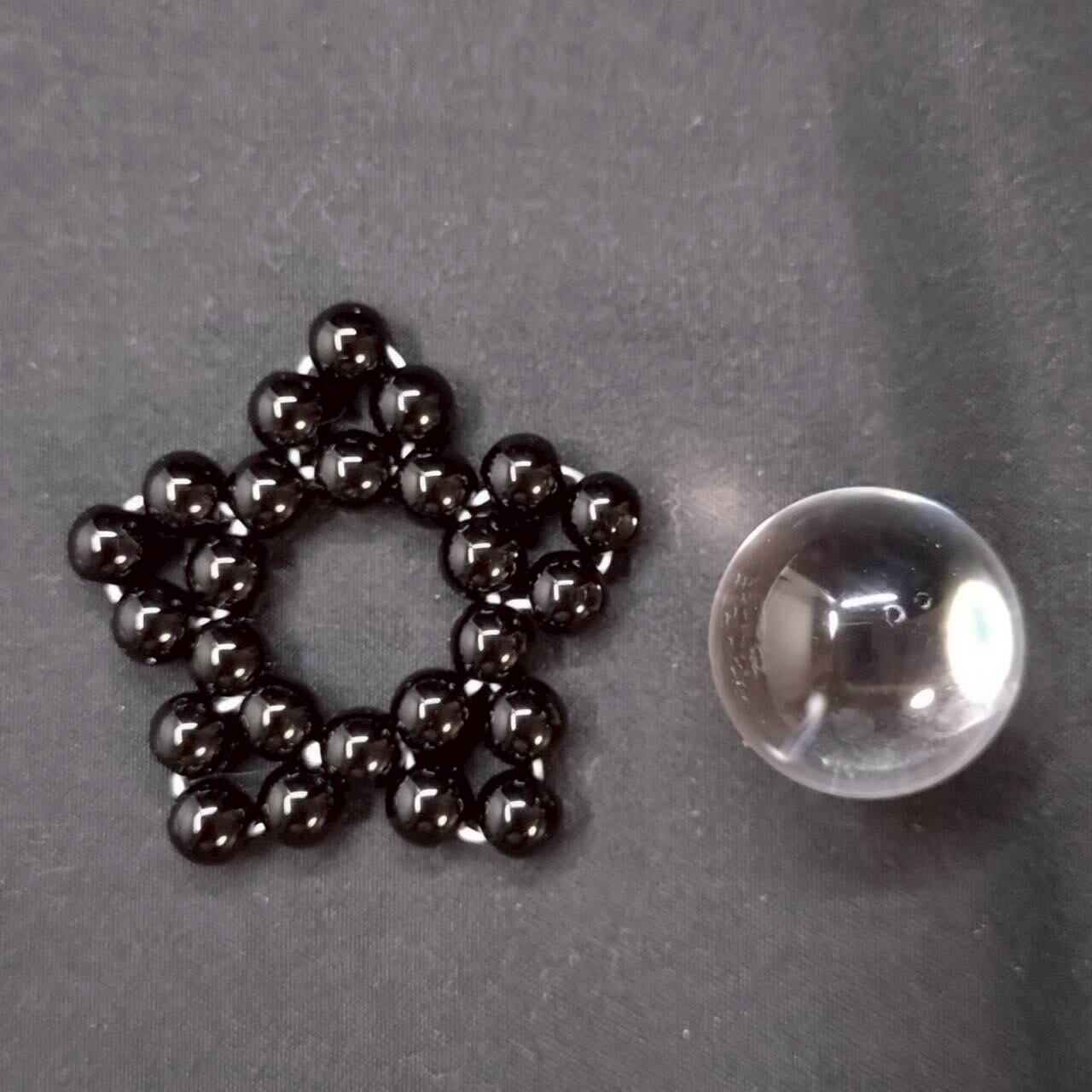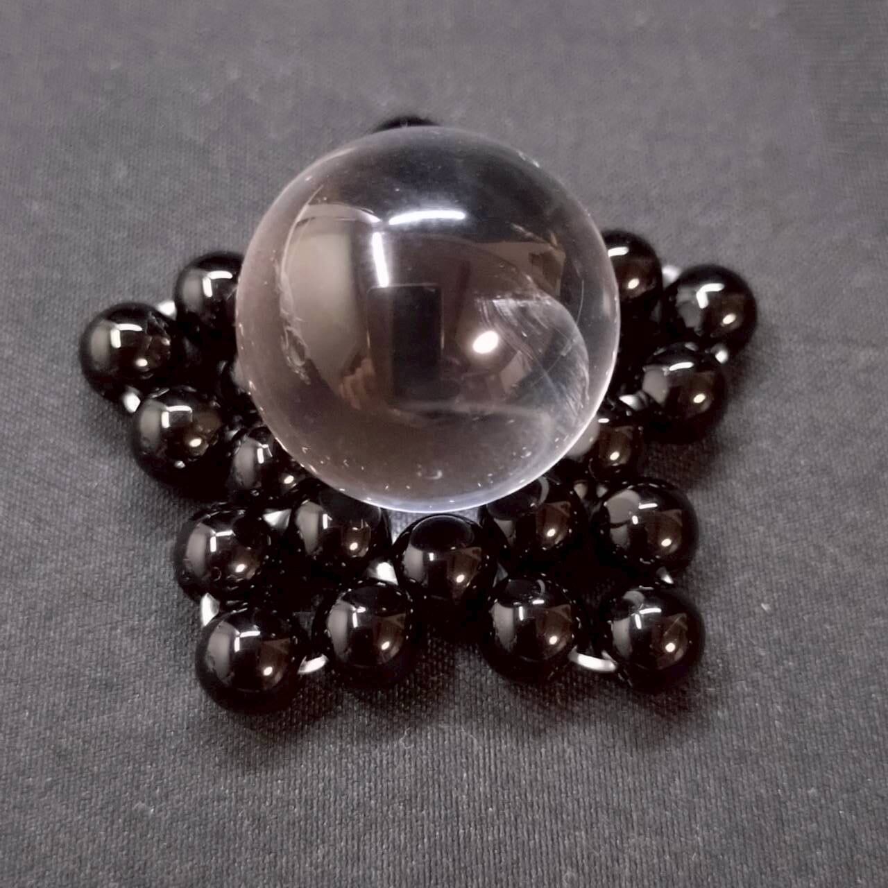 澄み渡る水晶玉(直径2cm)と、深い漆黒のオニキスで編み込んだ五芒星台座の特別な組み合わせ。