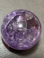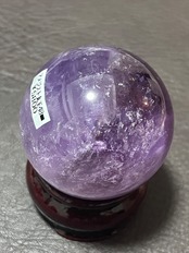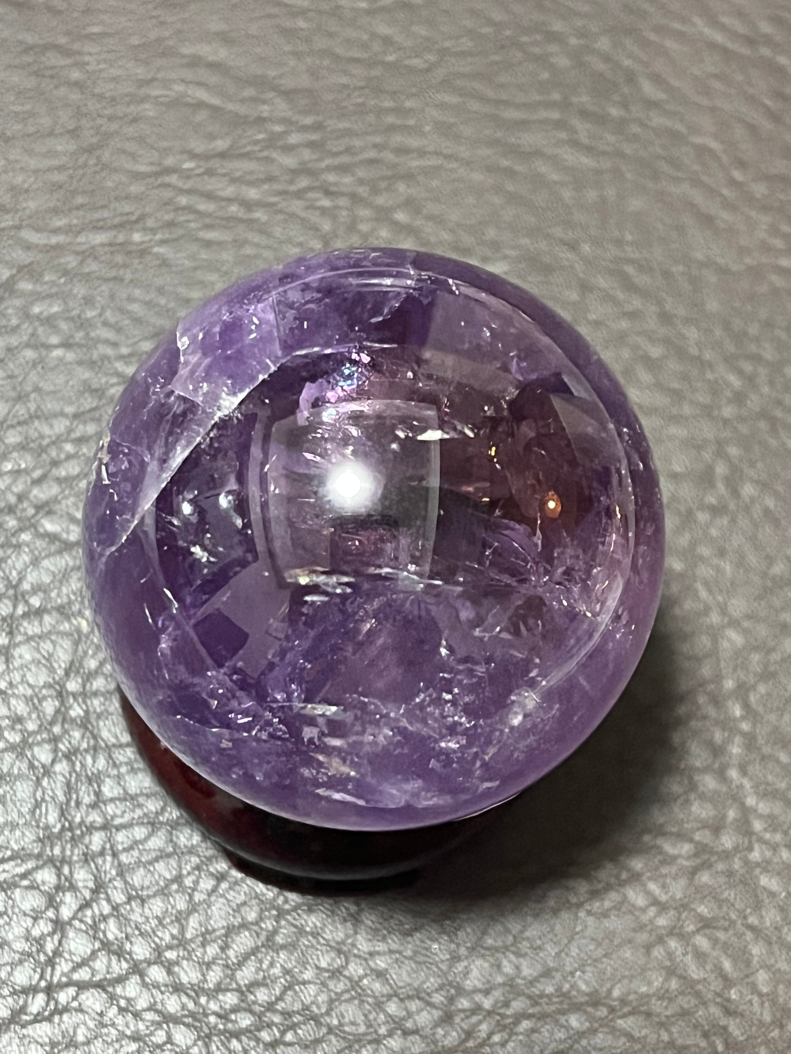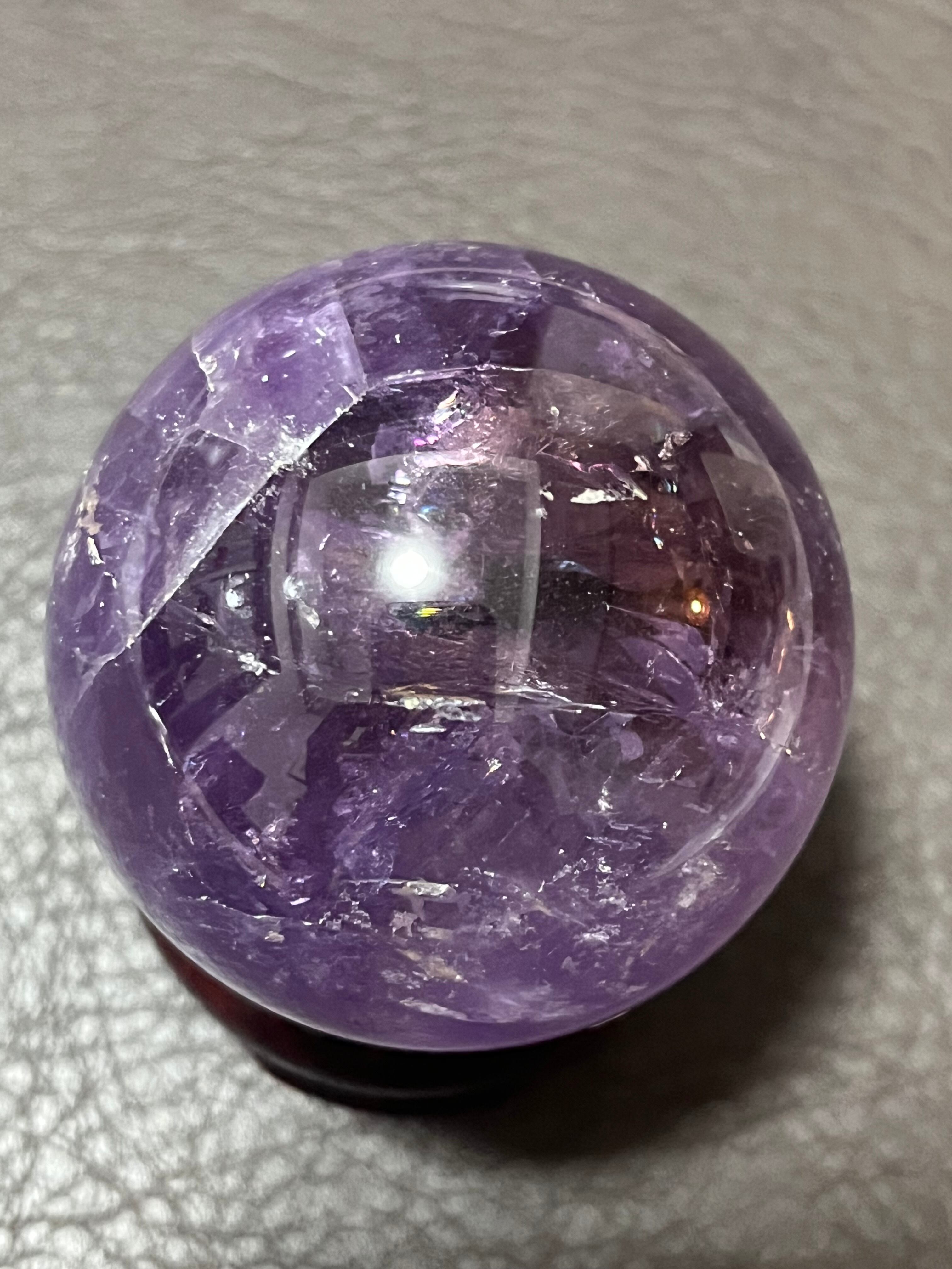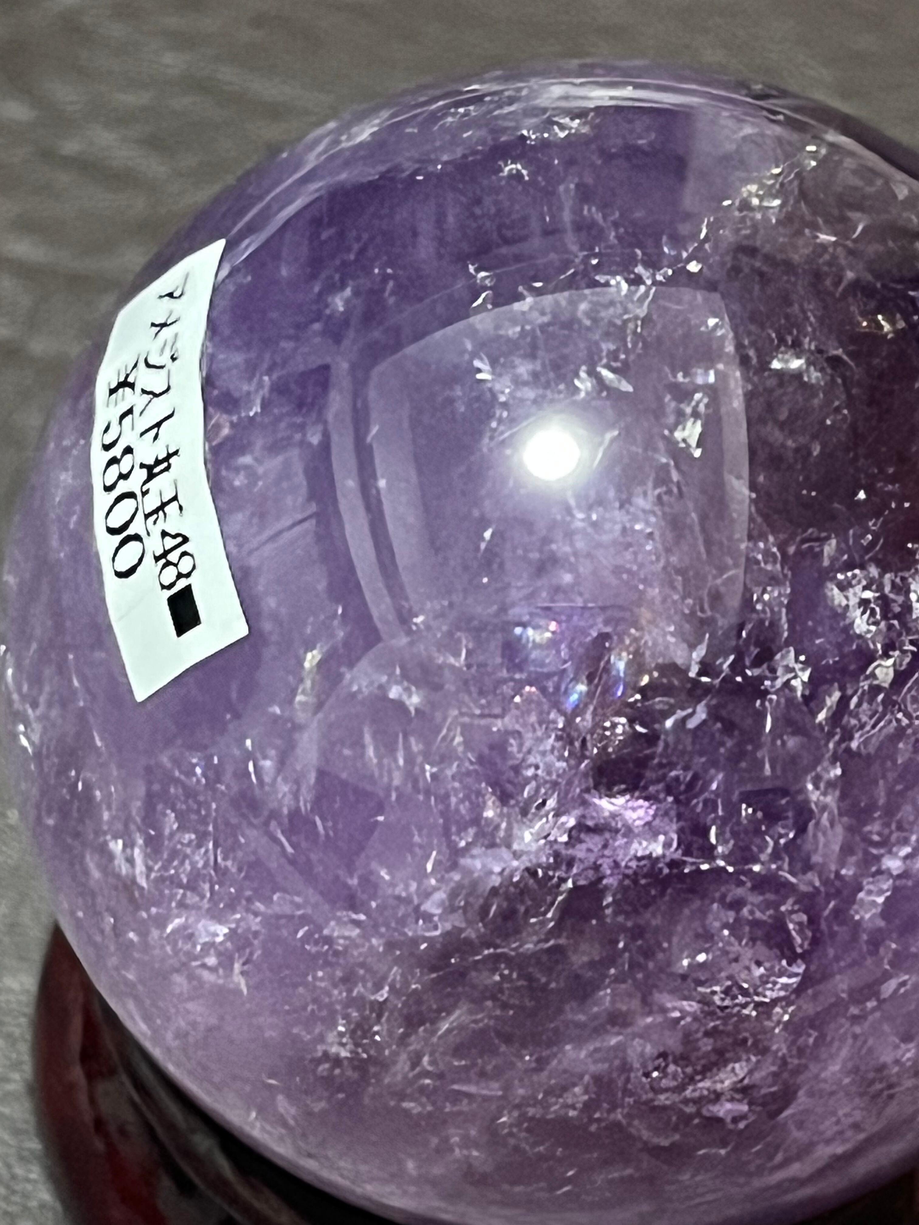 深みのある紫色が特徴で、透明感と自然な内包物が魅力の逸品です。直径約48mmで、今回特別に専用の木製スタンド付き!