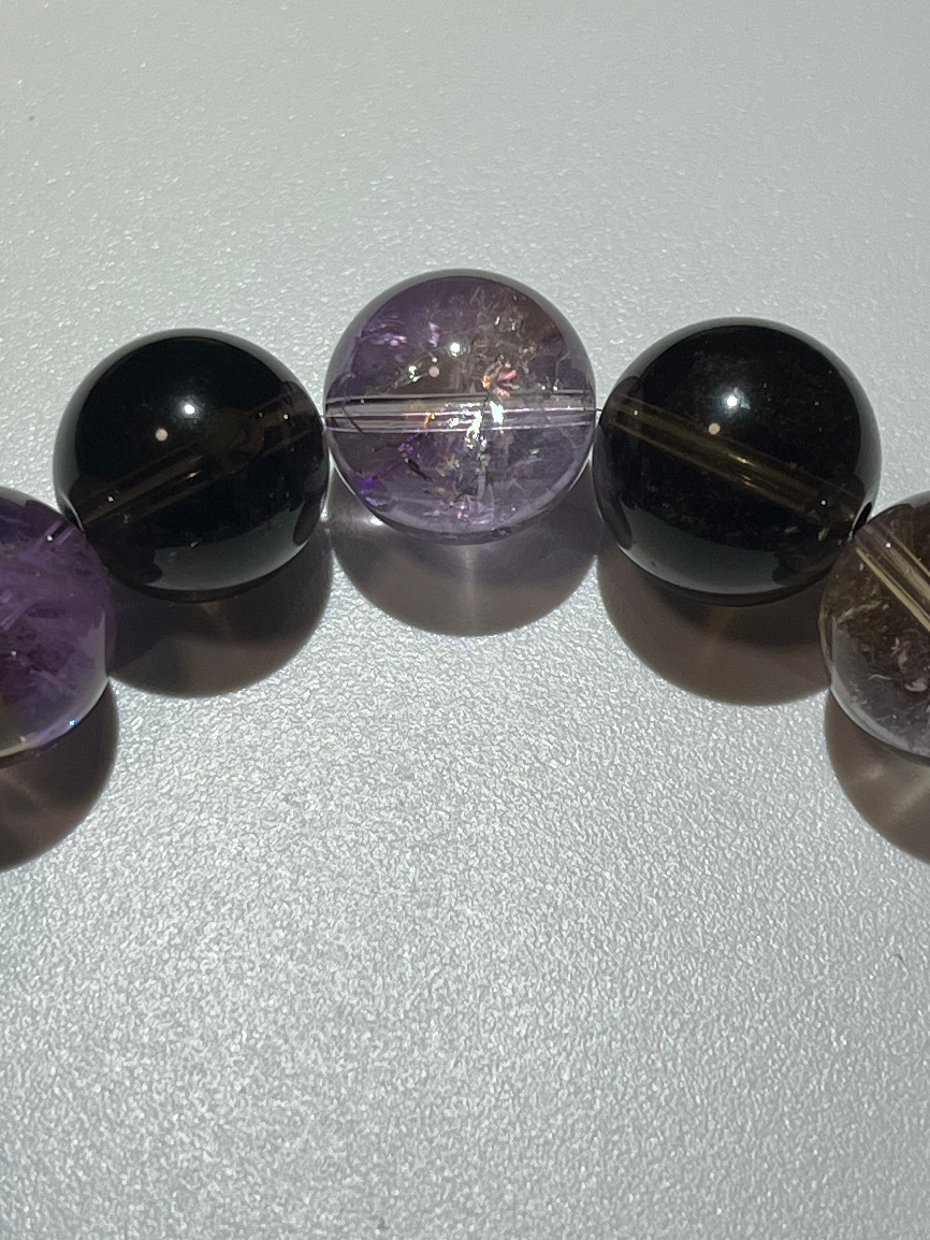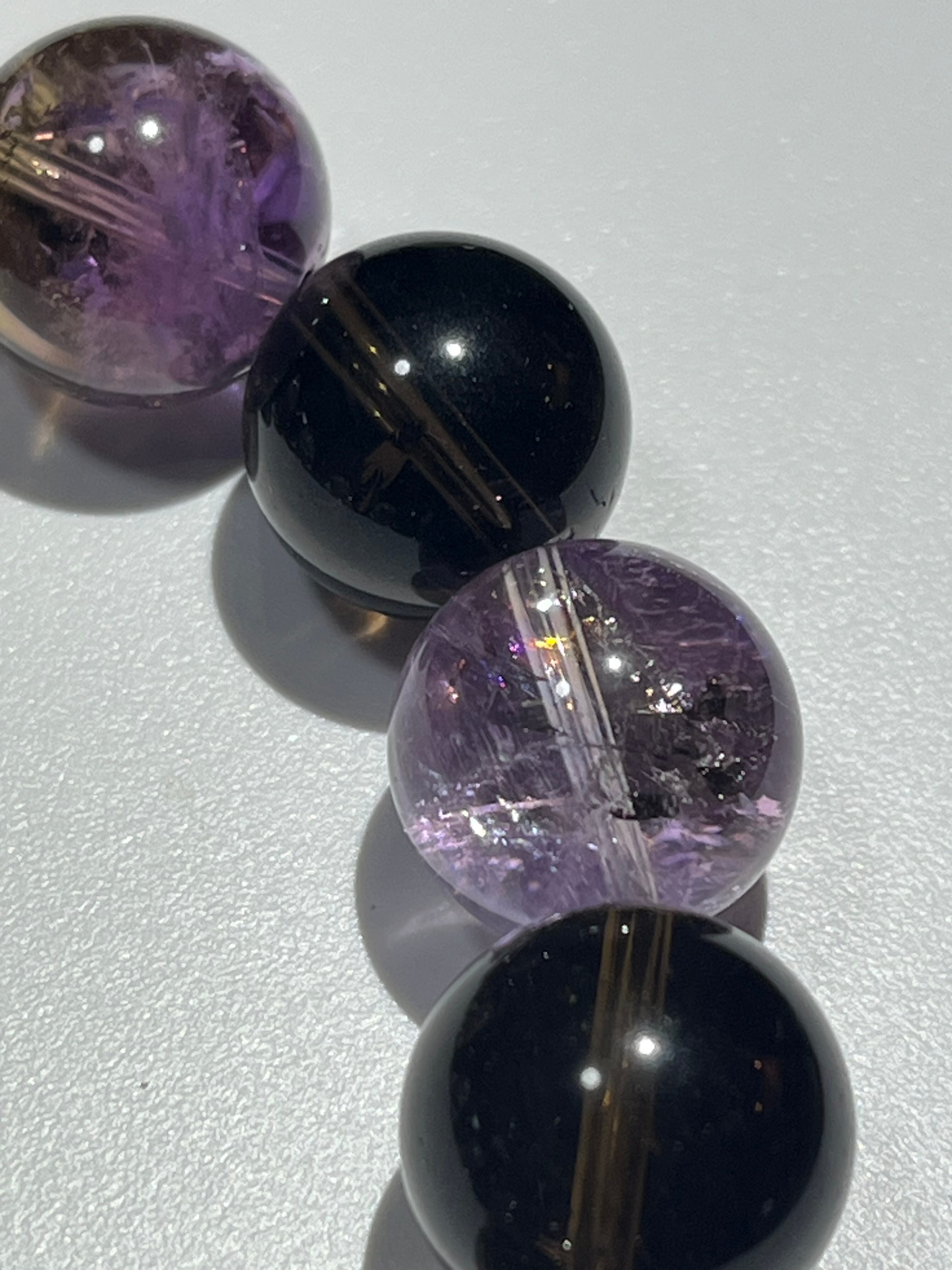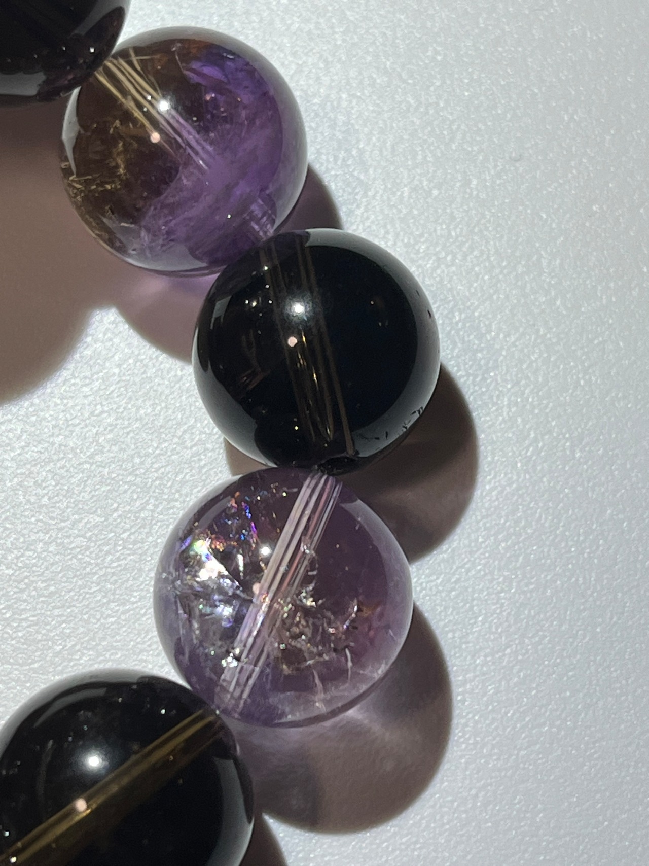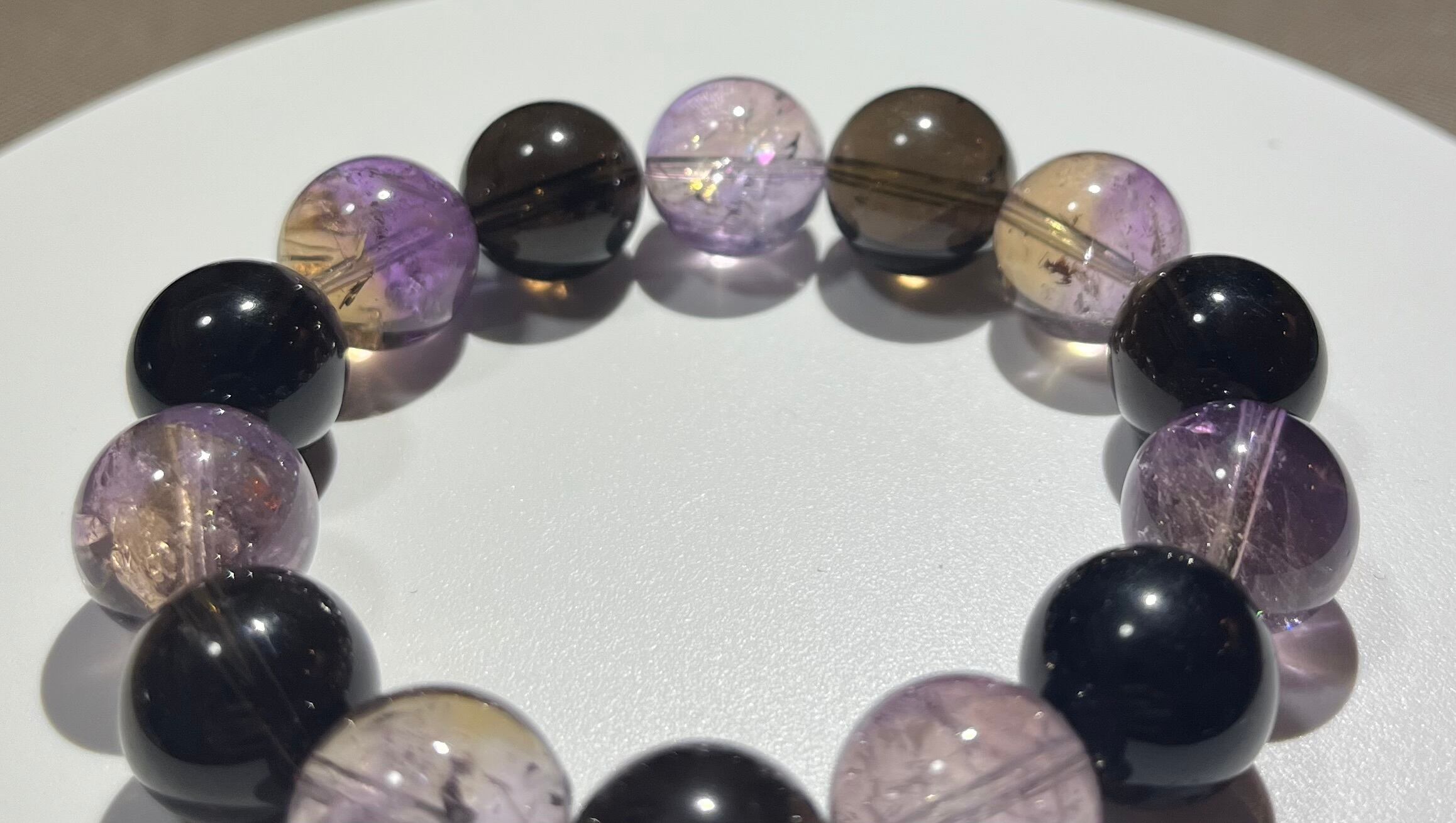 透明感あふれる紫と黄金のグラデーションが美しい アメトリンレインボー と、落ち着いたブラウンのスモーキーがかったチベット産のモリオンを組み合わせた、上品で存在感のあるブレスレットです。