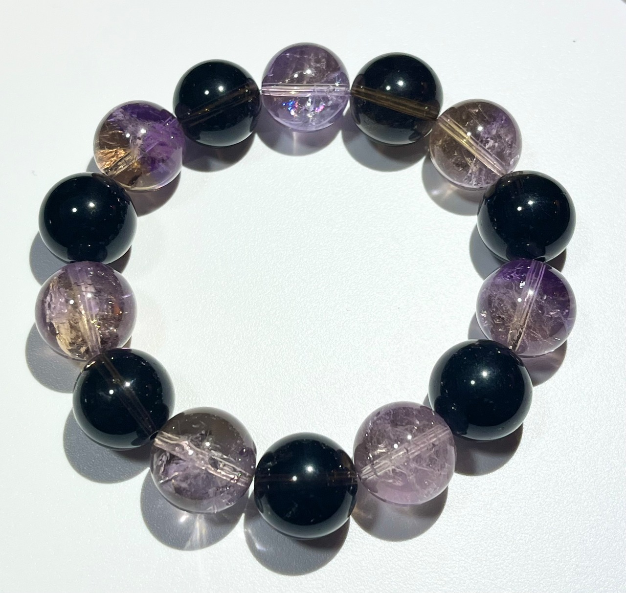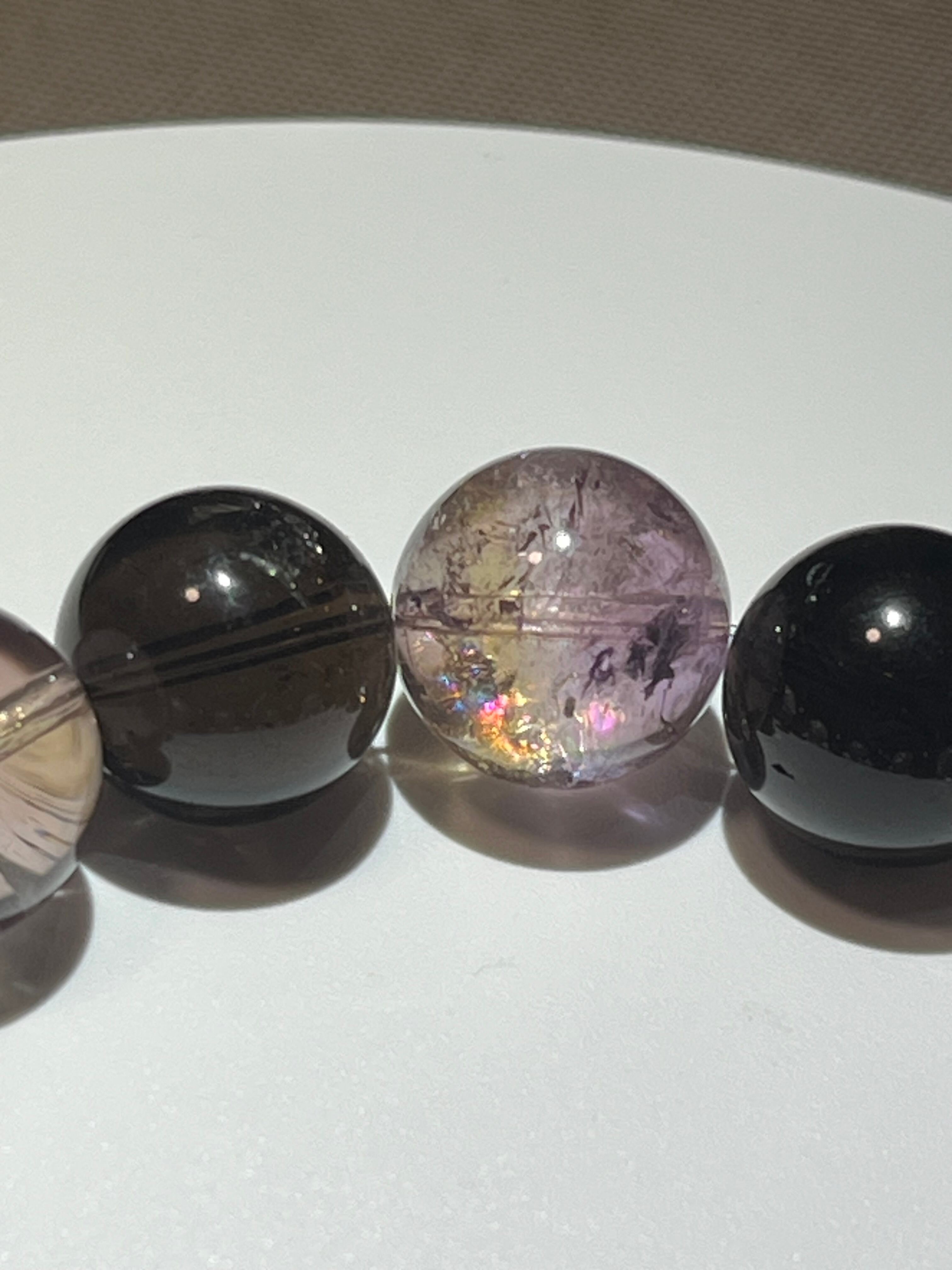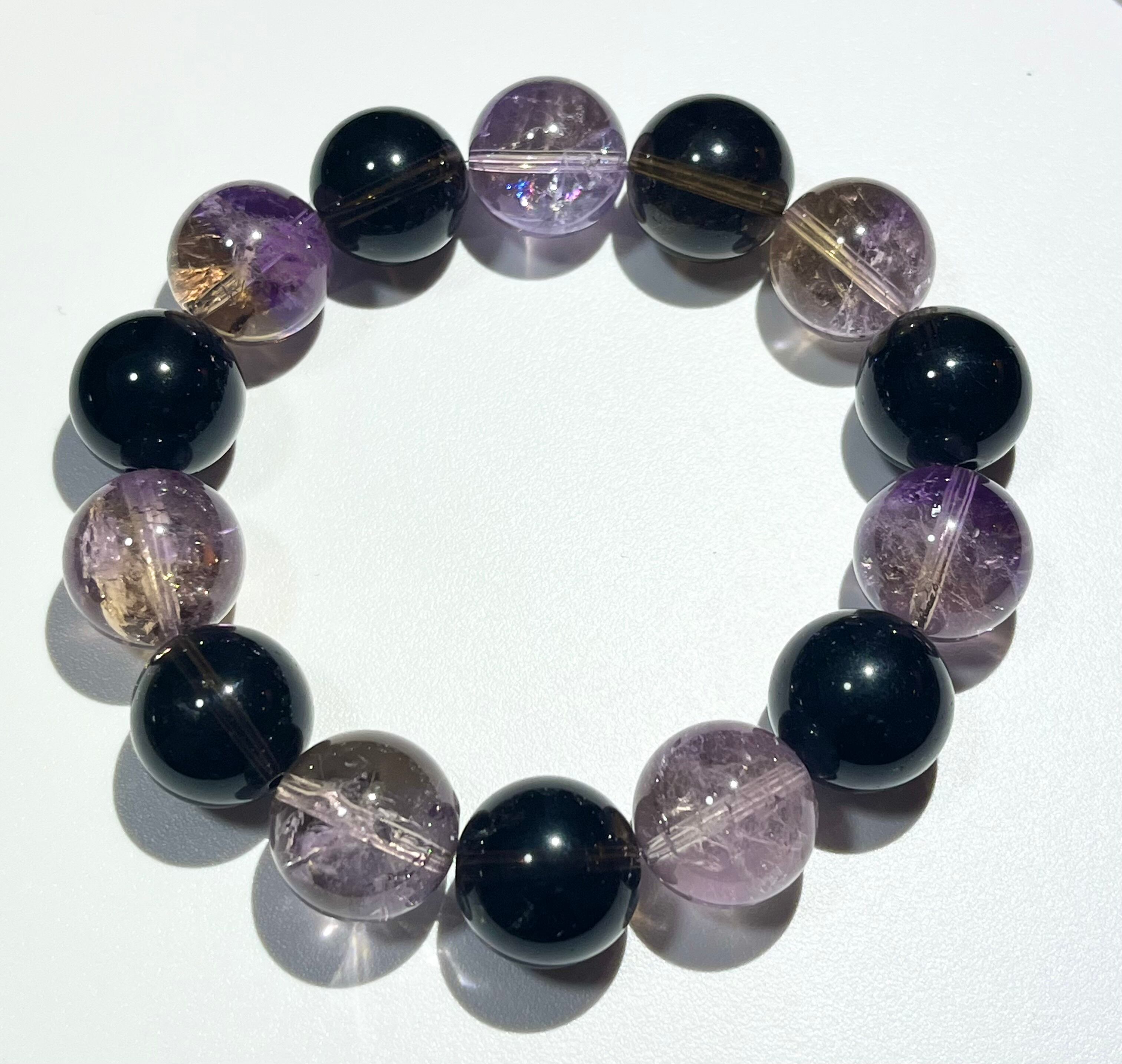 透明感あふれる紫と黄金のグラデーションが美しい アメトリンレインボー と、落ち着いたブラウンのスモーキーがかったチベット産のモリオンを組み合わせた、上品で存在感のあるブレスレットです。