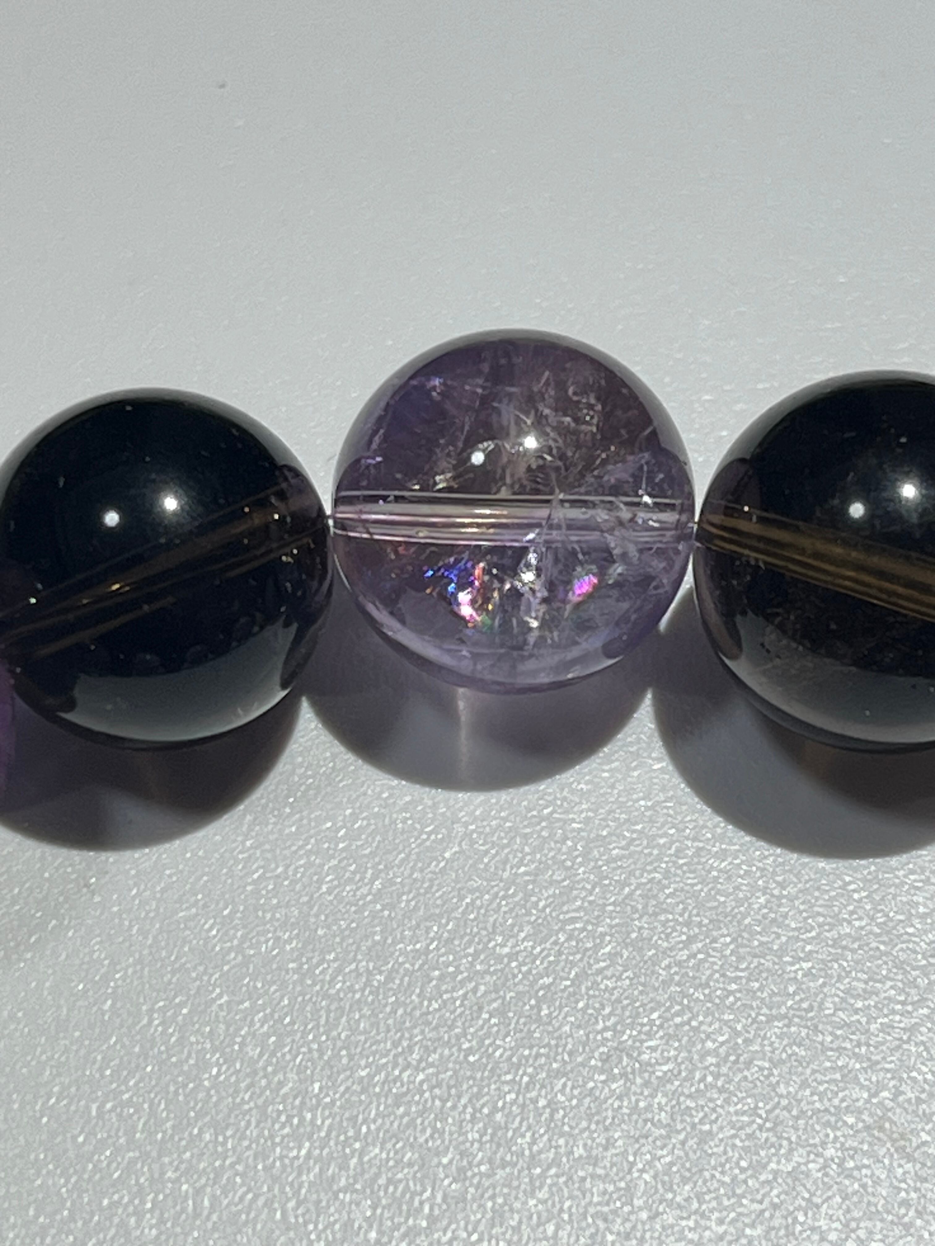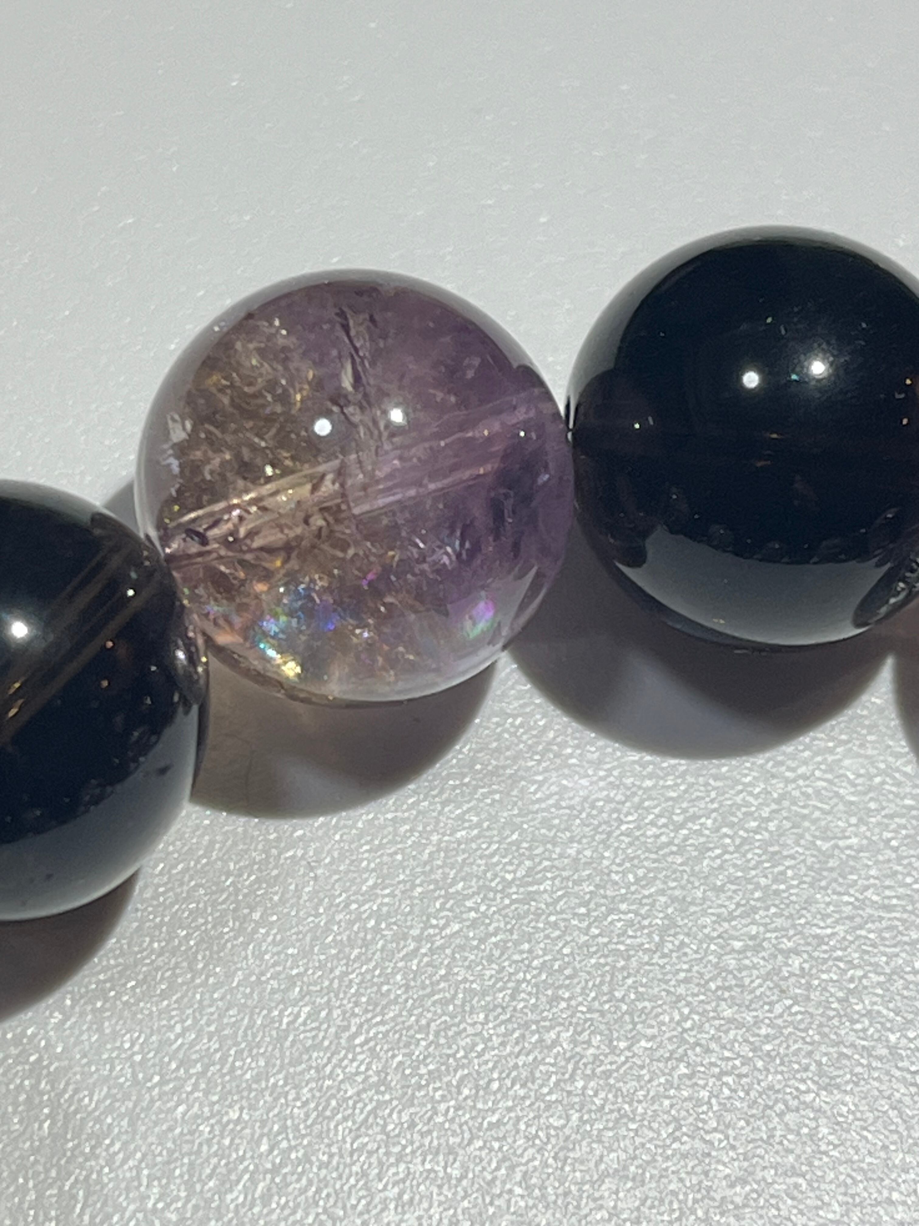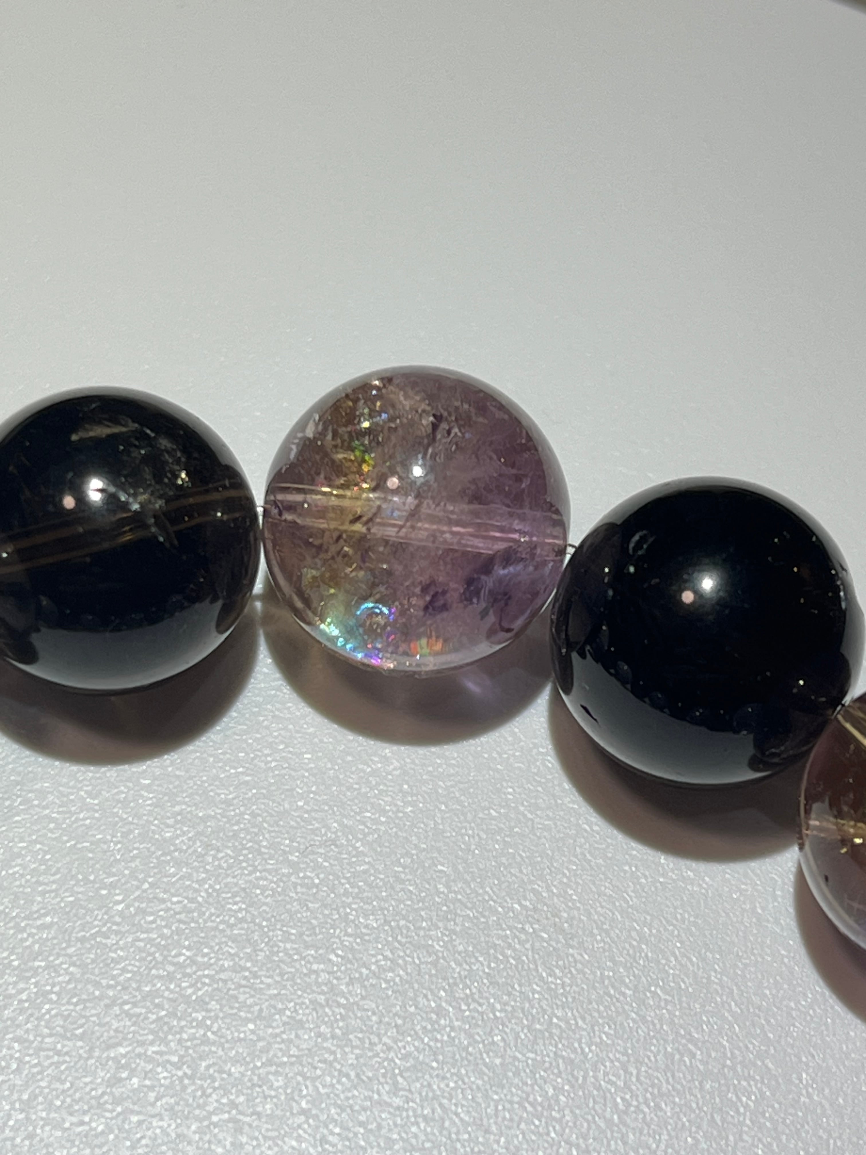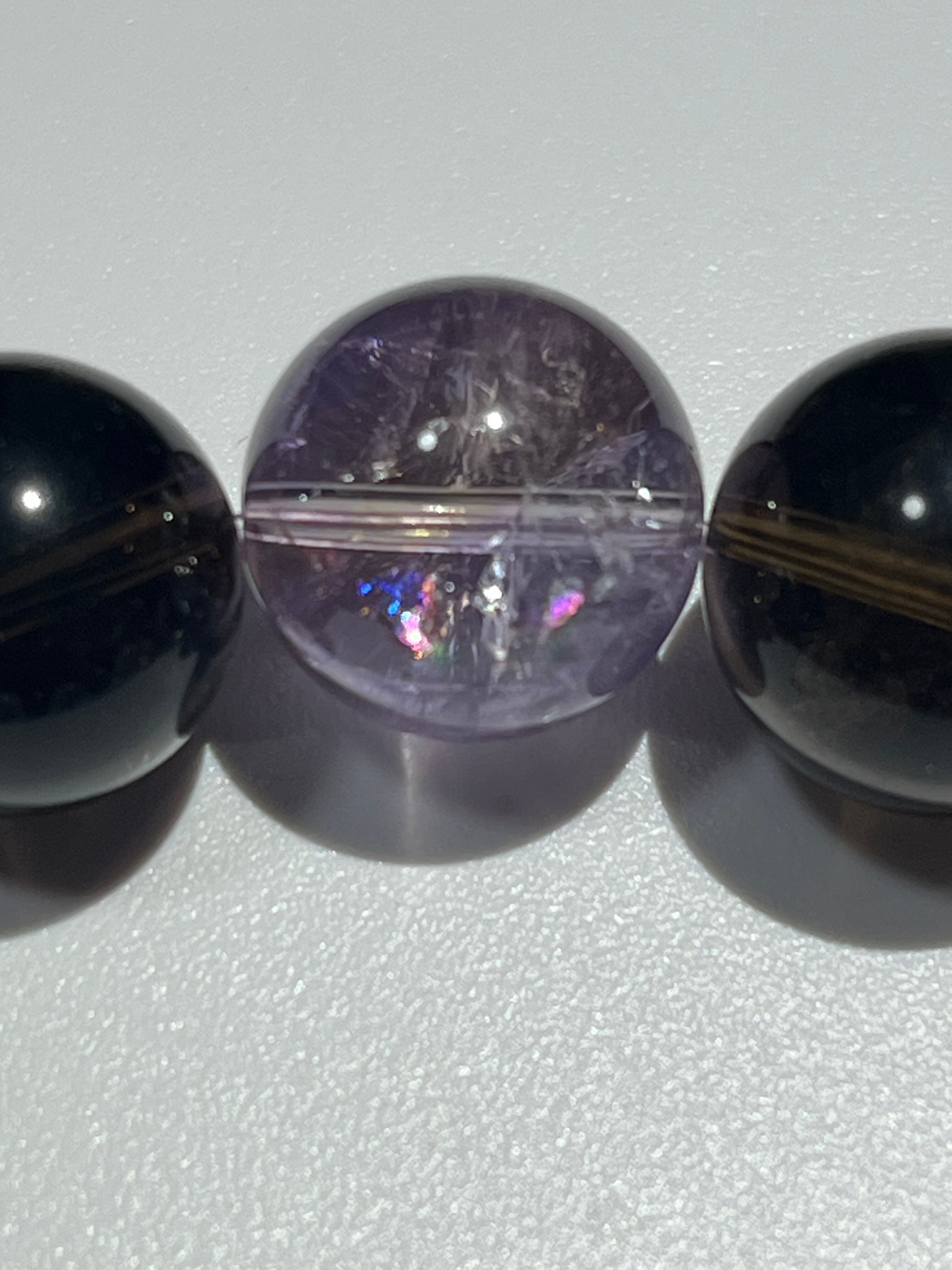 透明感あふれる紫と黄金のグラデーションが美しい アメトリンレインボー と、落ち着いたブラウンのスモーキーがかったチベット産のモリオンを組み合わせた、上品で存在感のあるブレスレットです。
