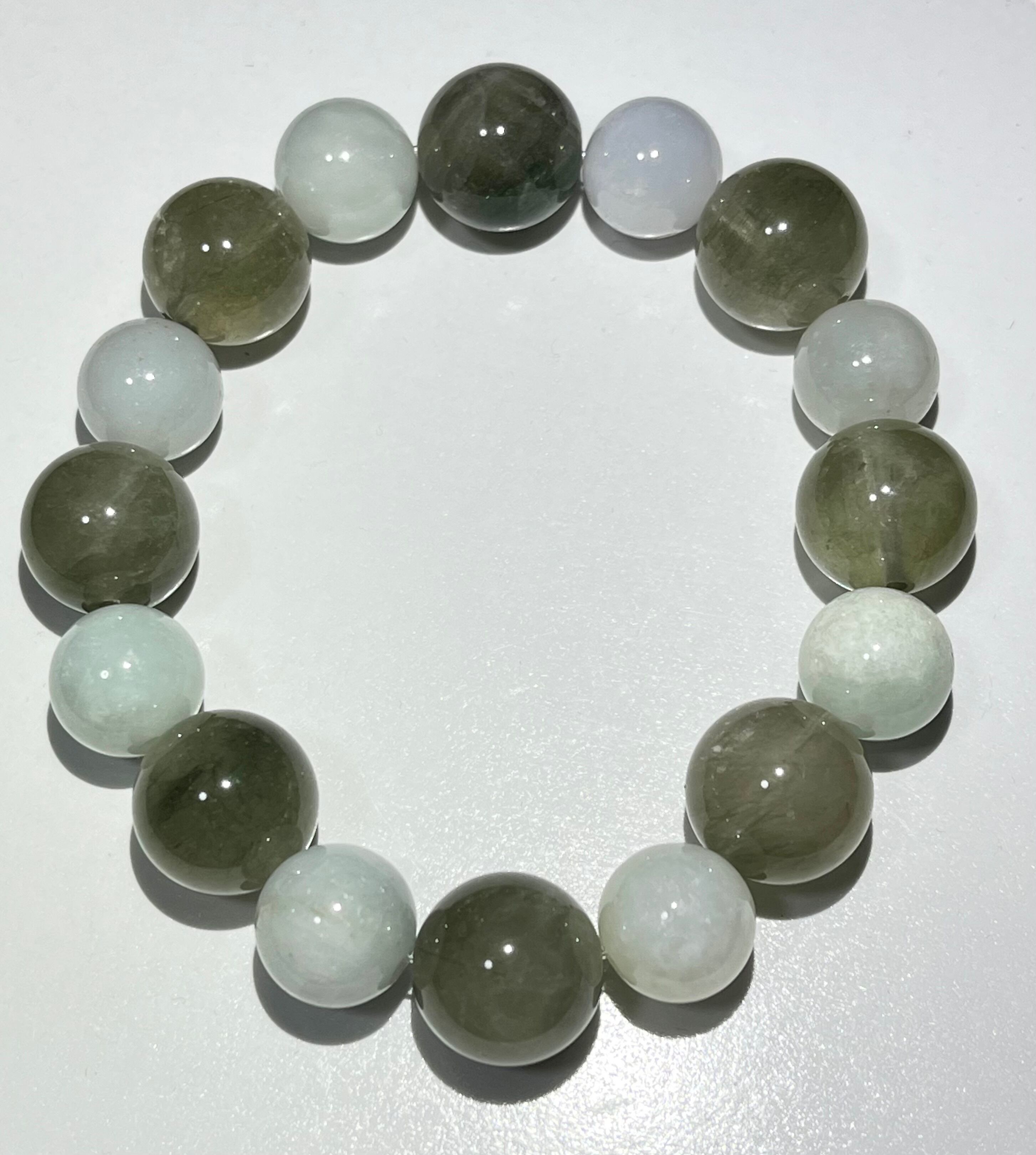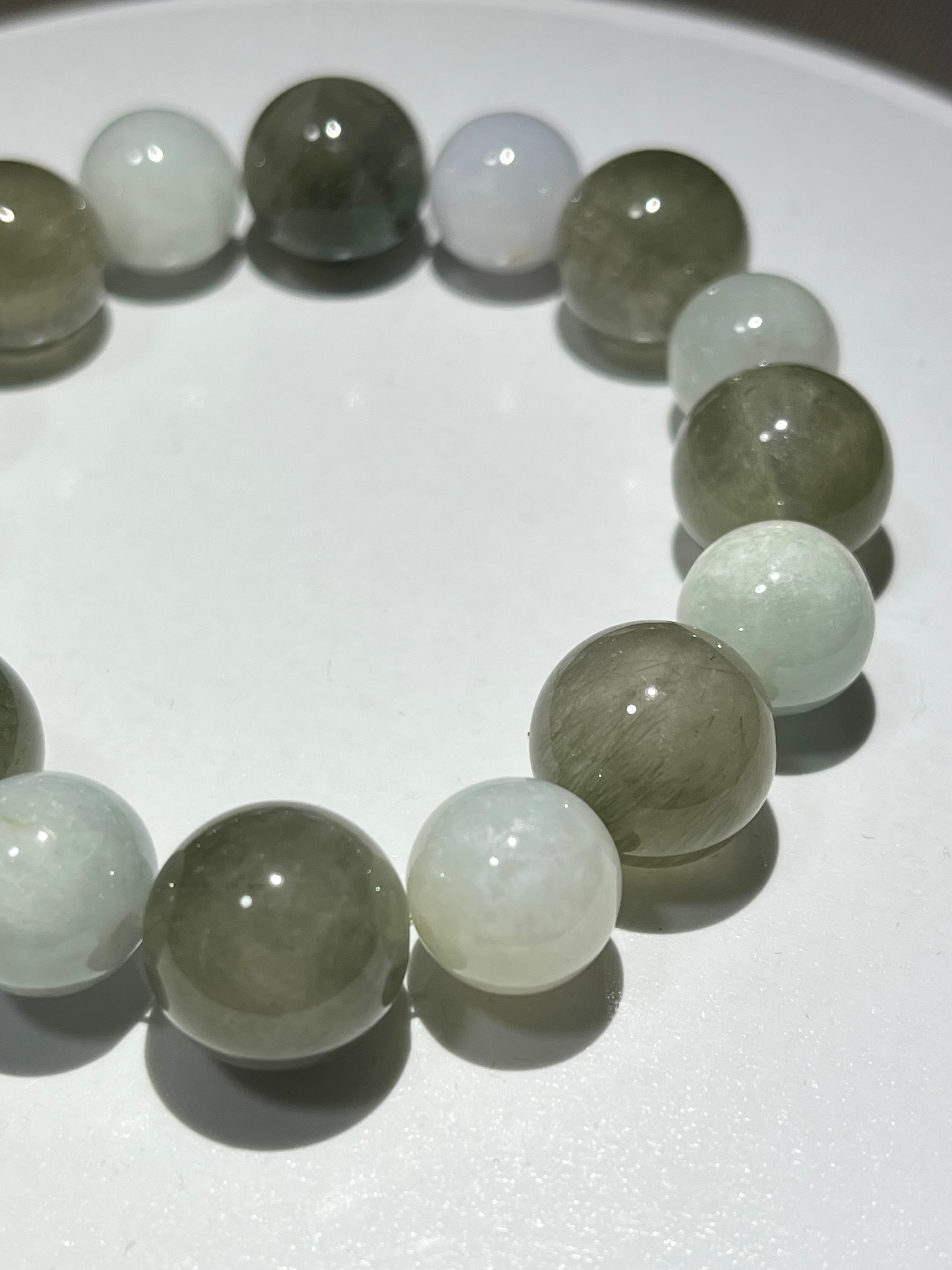 このブレスレットは、深い緑色と透明感のあるグリーンルチル、そして穏やかな翡翠の天然石を組み合わせた贅沢なアクセサリーです。