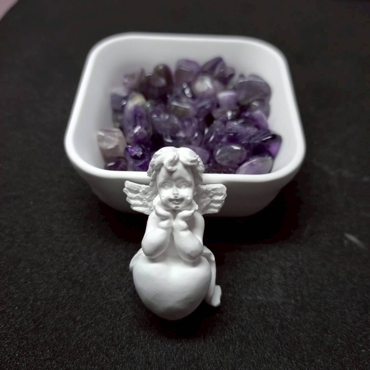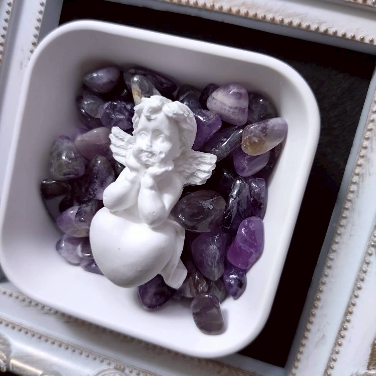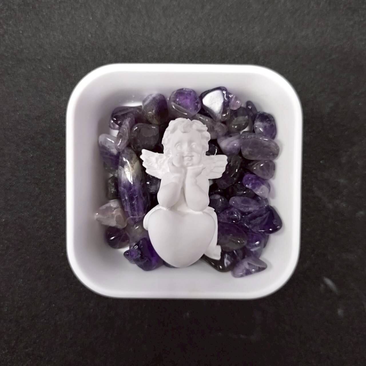 祈るように佇む可愛らしい天使のアロマストーンに、「癒し」と「安眠」の石として知られるアメジストのさざれ石を組み合わせた、特別なヒーリングセットです。