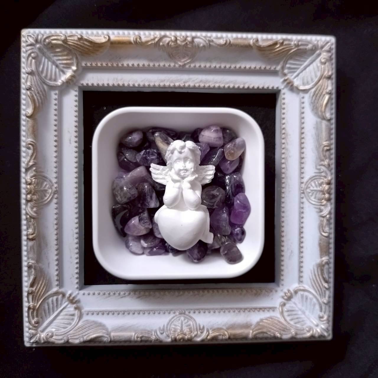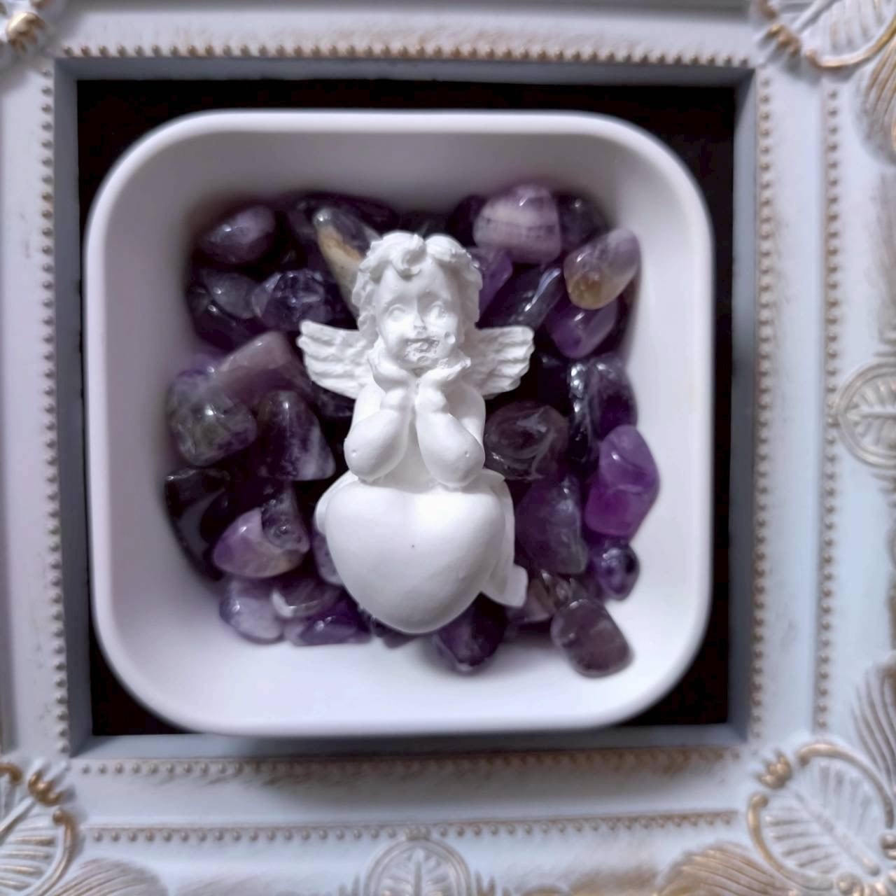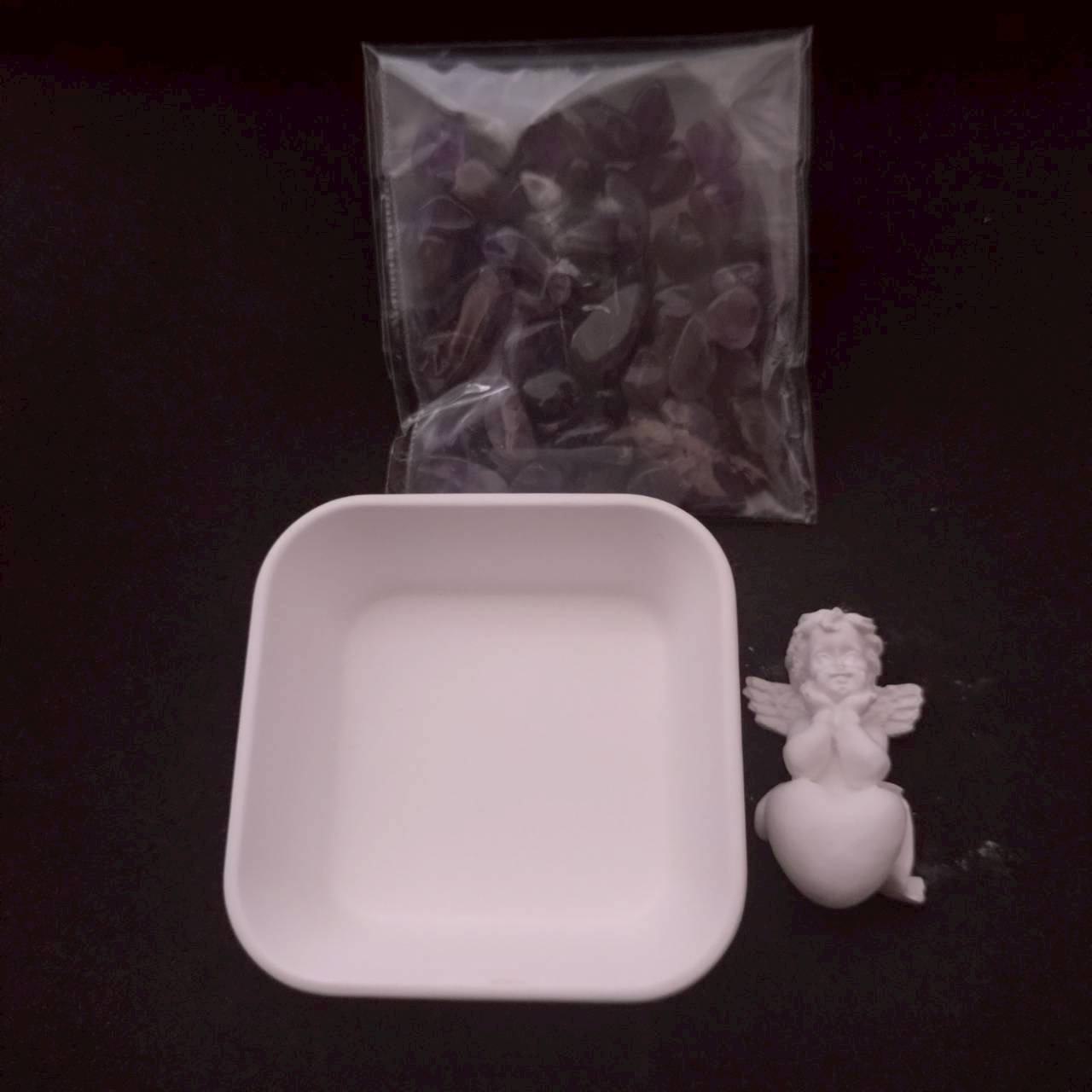 祈るように佇む可愛らしい天使のアロマストーンに、「癒し」と「安眠」の石として知られるアメジストのさざれ石を組み合わせた、特別なヒーリングセットです。