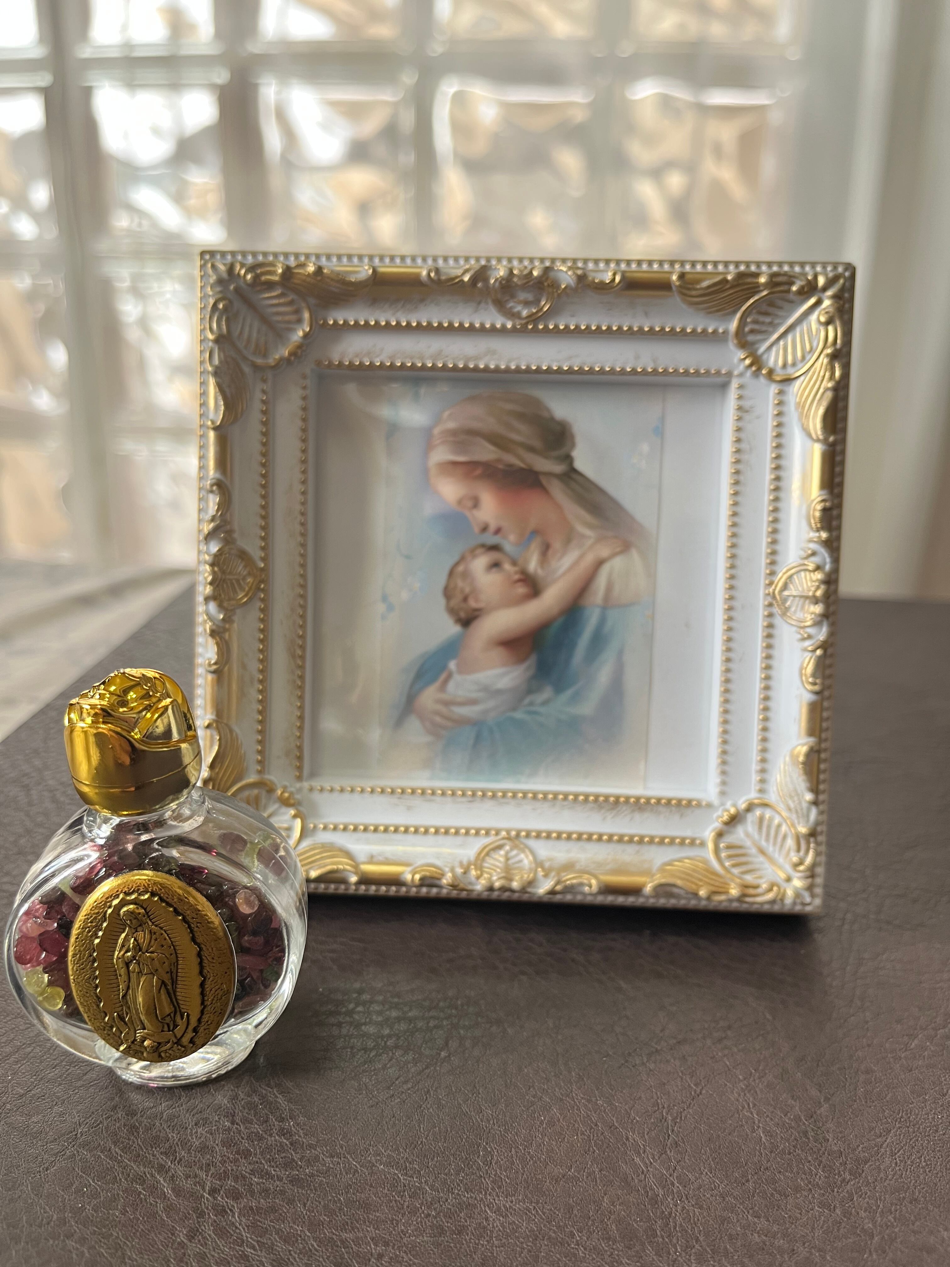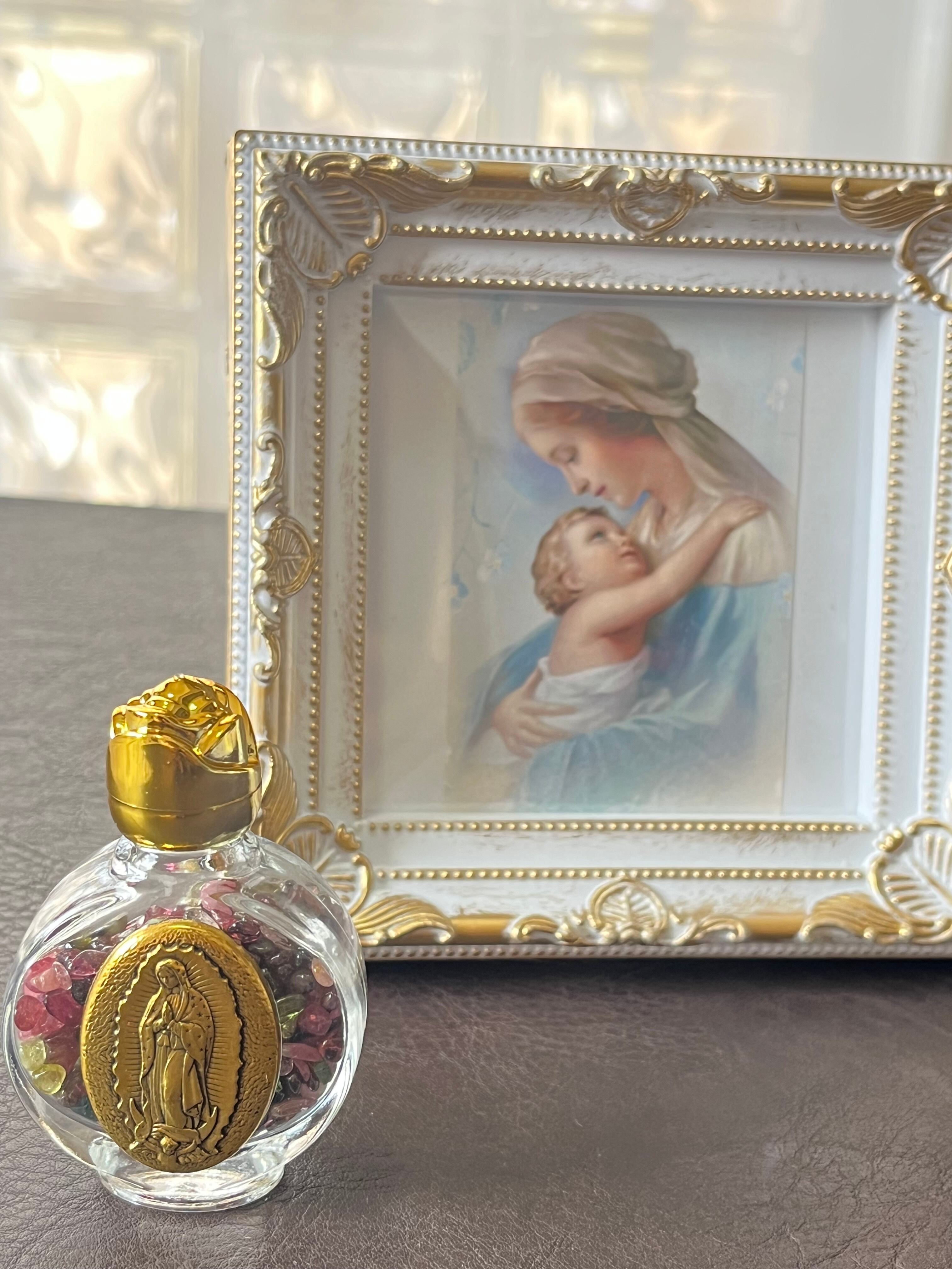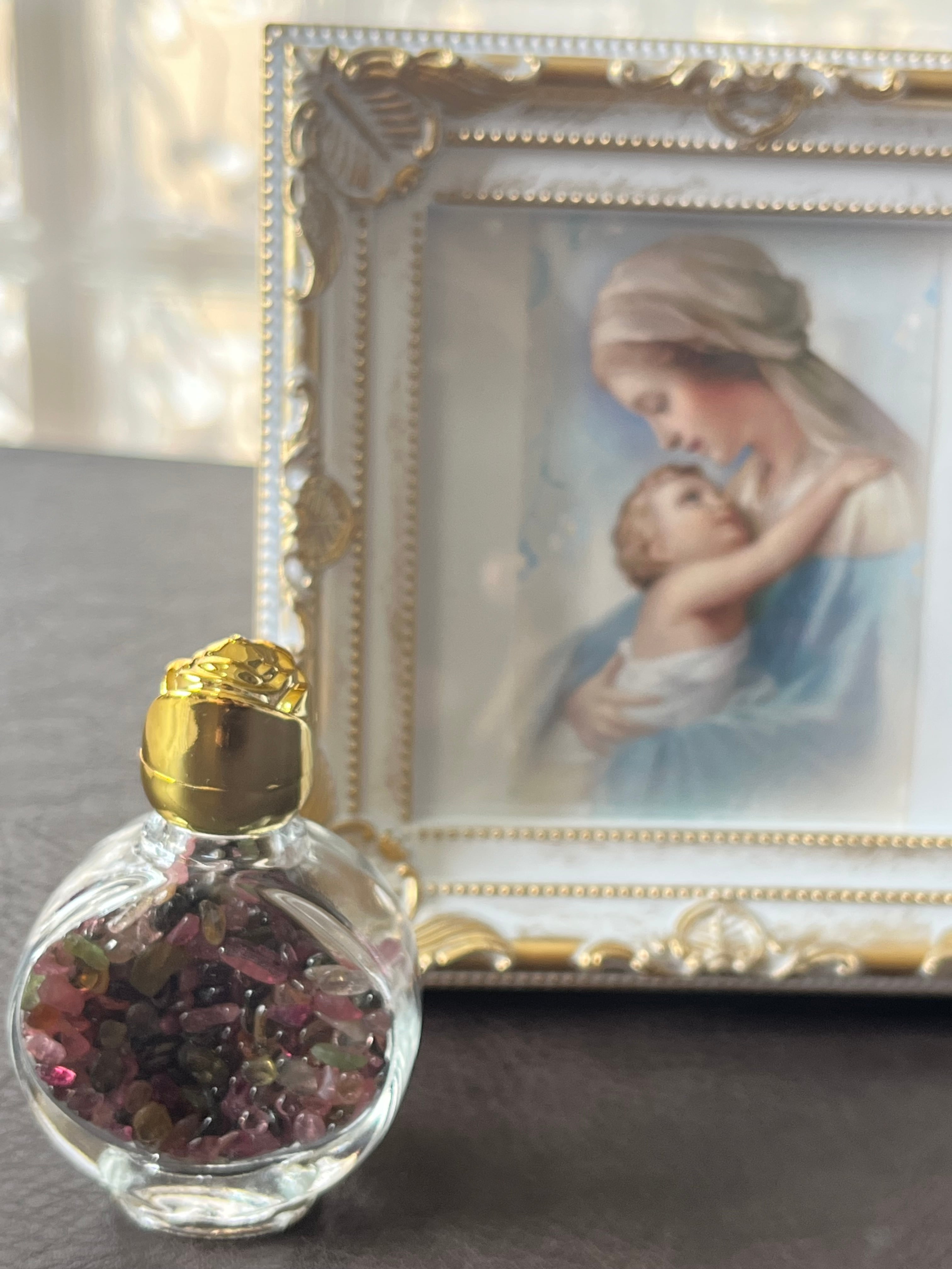優しい微笑みで見守ってくださるマリア様のガラスボトルに、天然石のさざれを詰め込みンました。