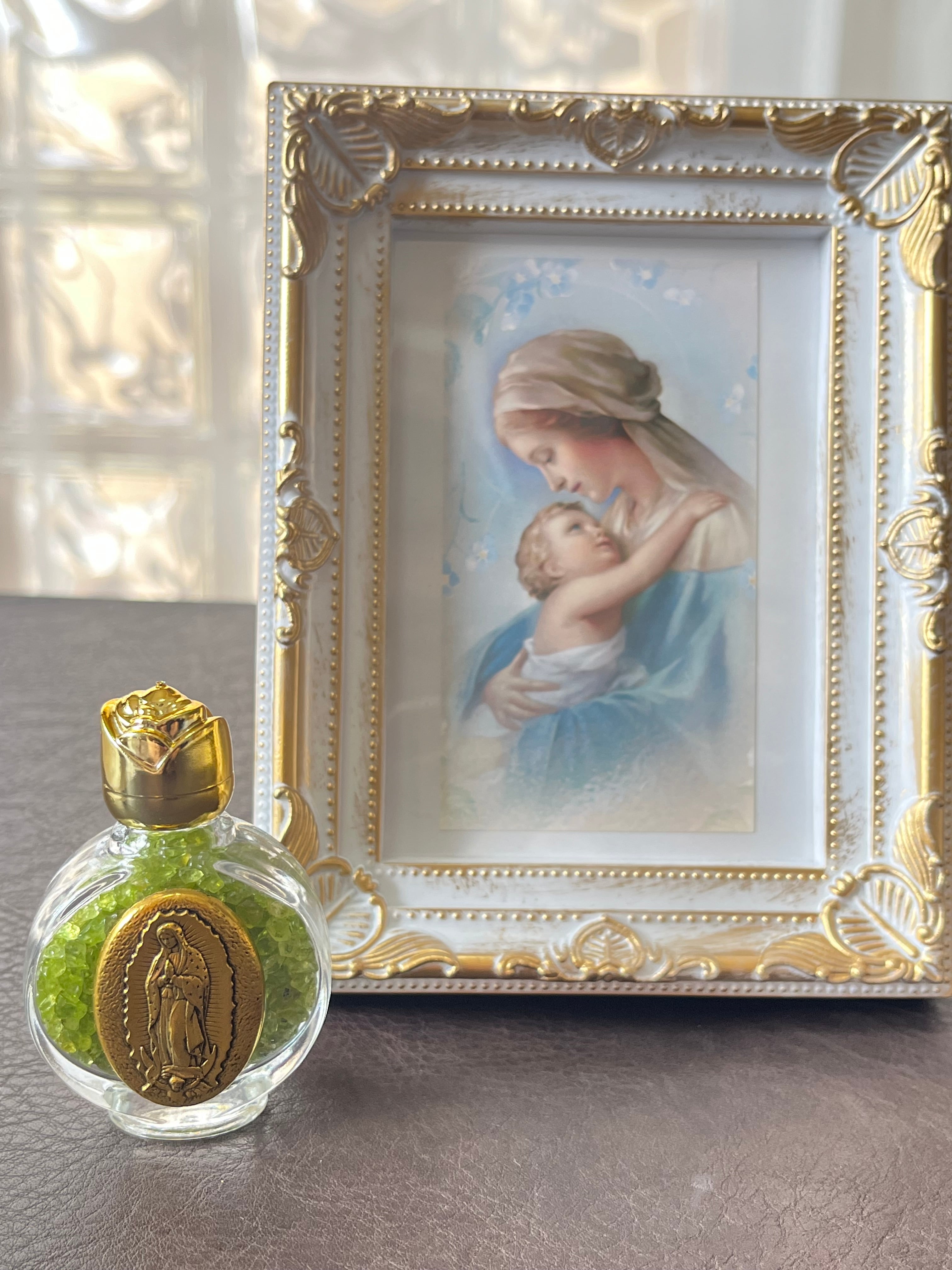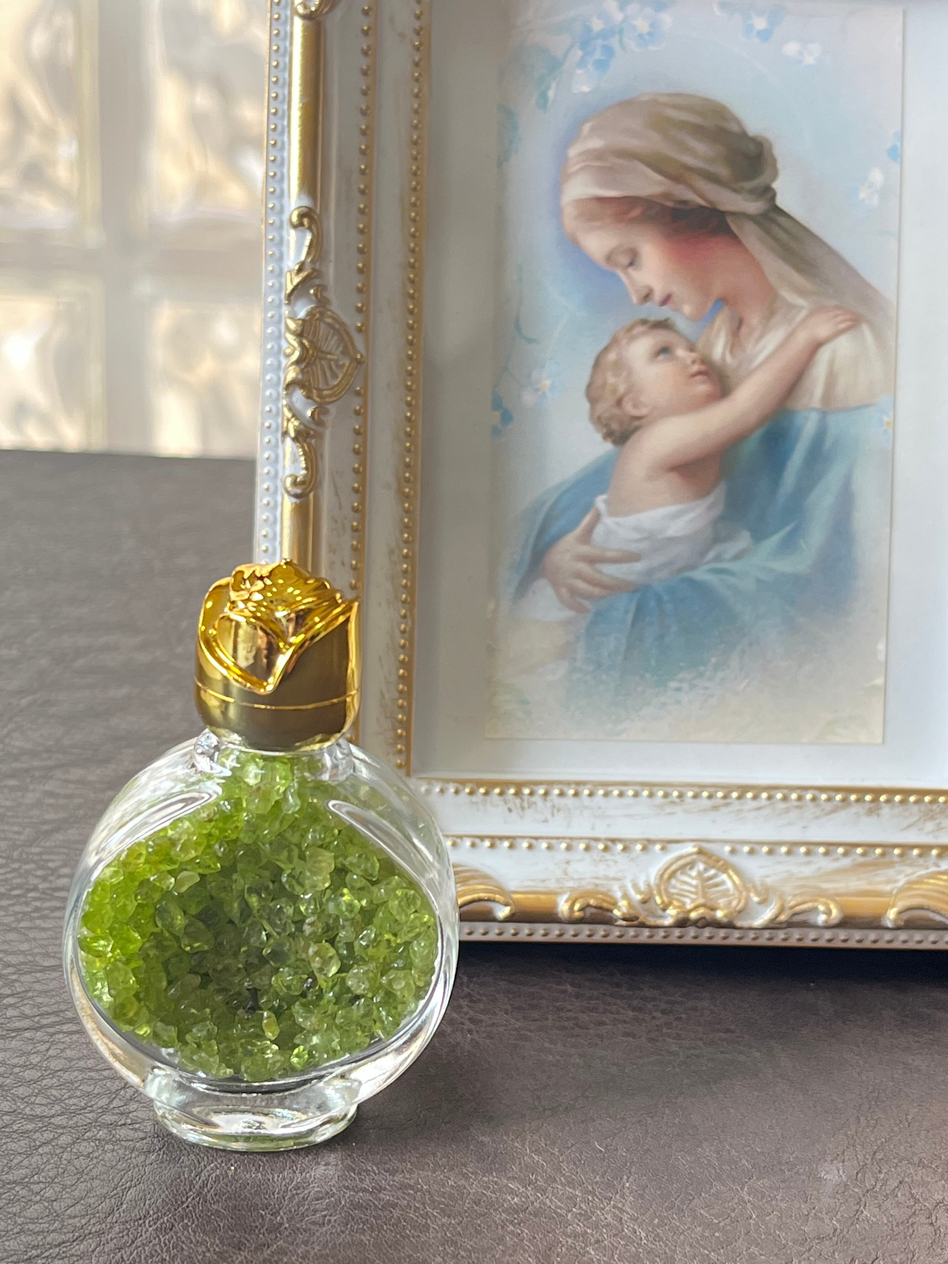 優しい微笑みで見守ってくださるマリア様のガラスボトルに、天然石のさざれを詰め込みました。