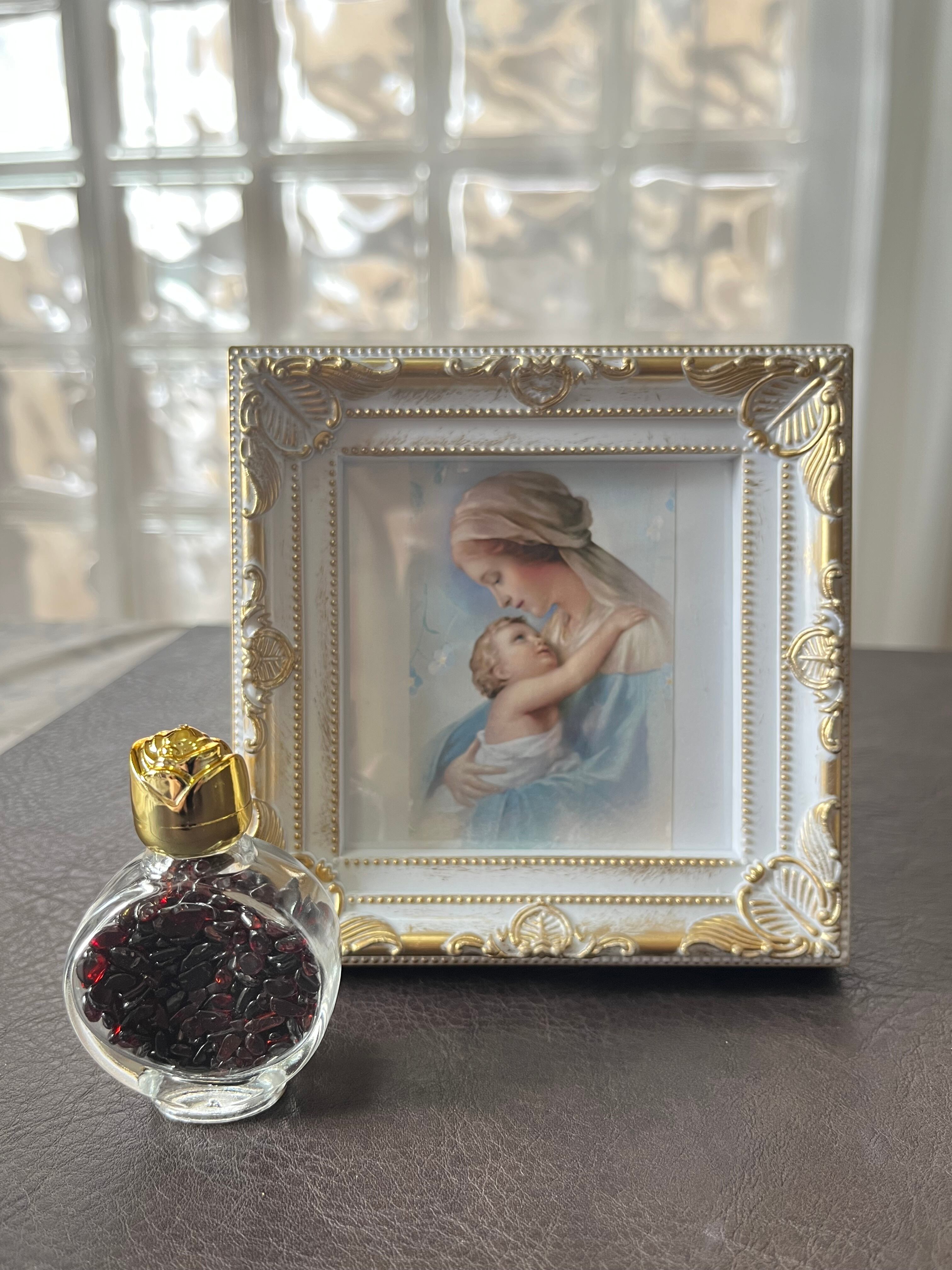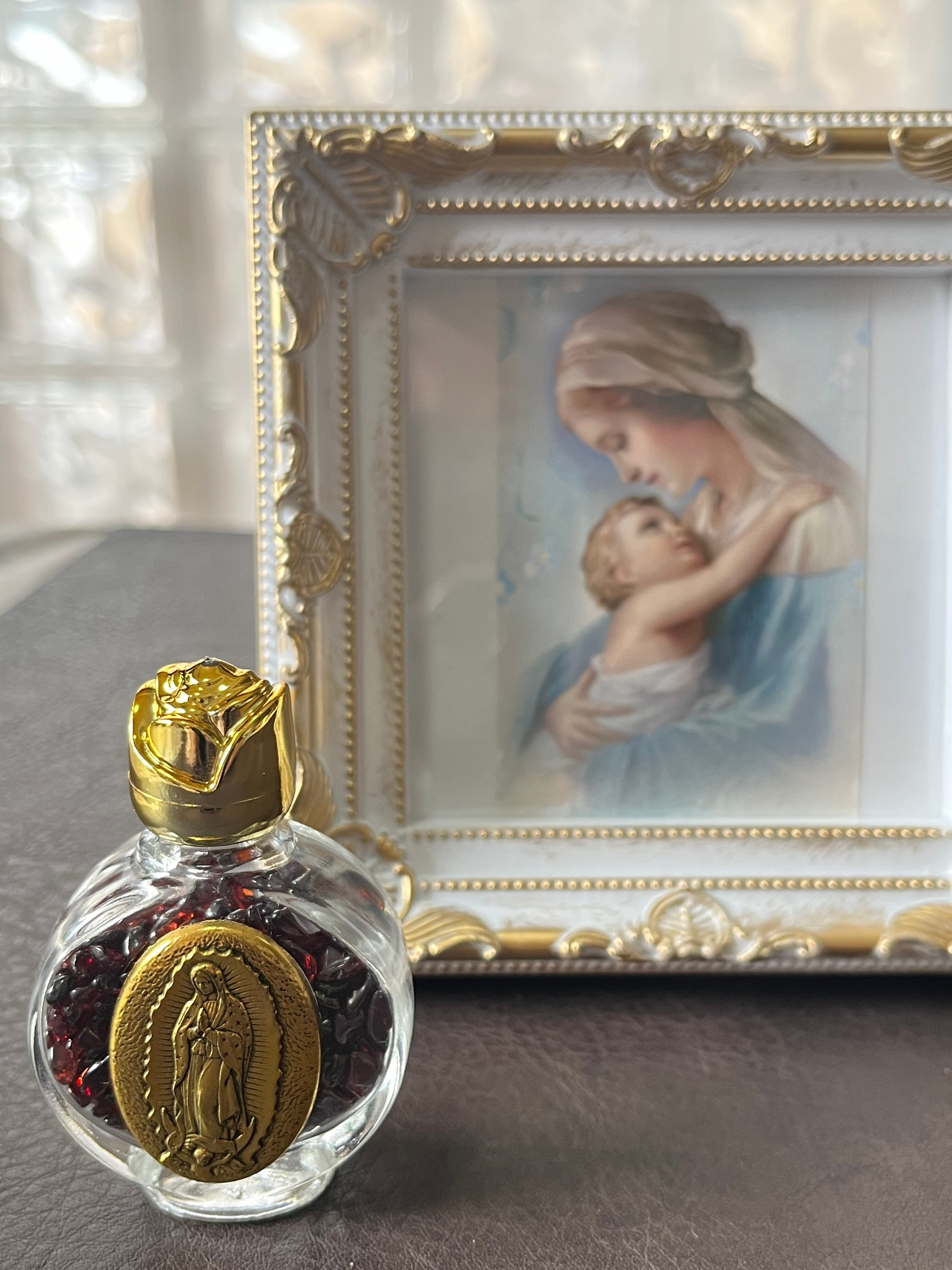 優しい微笑みで見守ってくださるマリア様のガラスボトルに、天然石のさざれを詰め込みました。